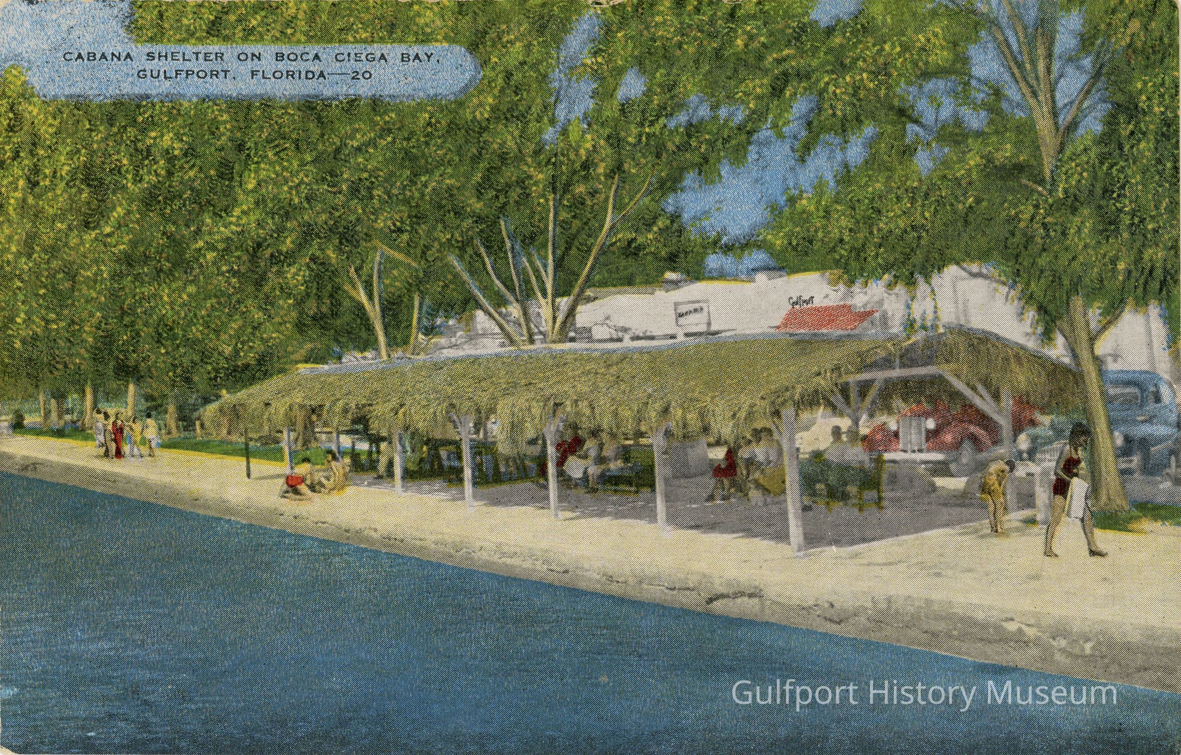 Bringing native atmosphere to Boca Ciega Bay / in Gulfport is this comfortable thatched roof, / cabana shelter. Visitors spend many hours en- / joying watching the bathers and fisherman and / seeing the dolphin and porpoise swim about close / to the shores.Transcriber