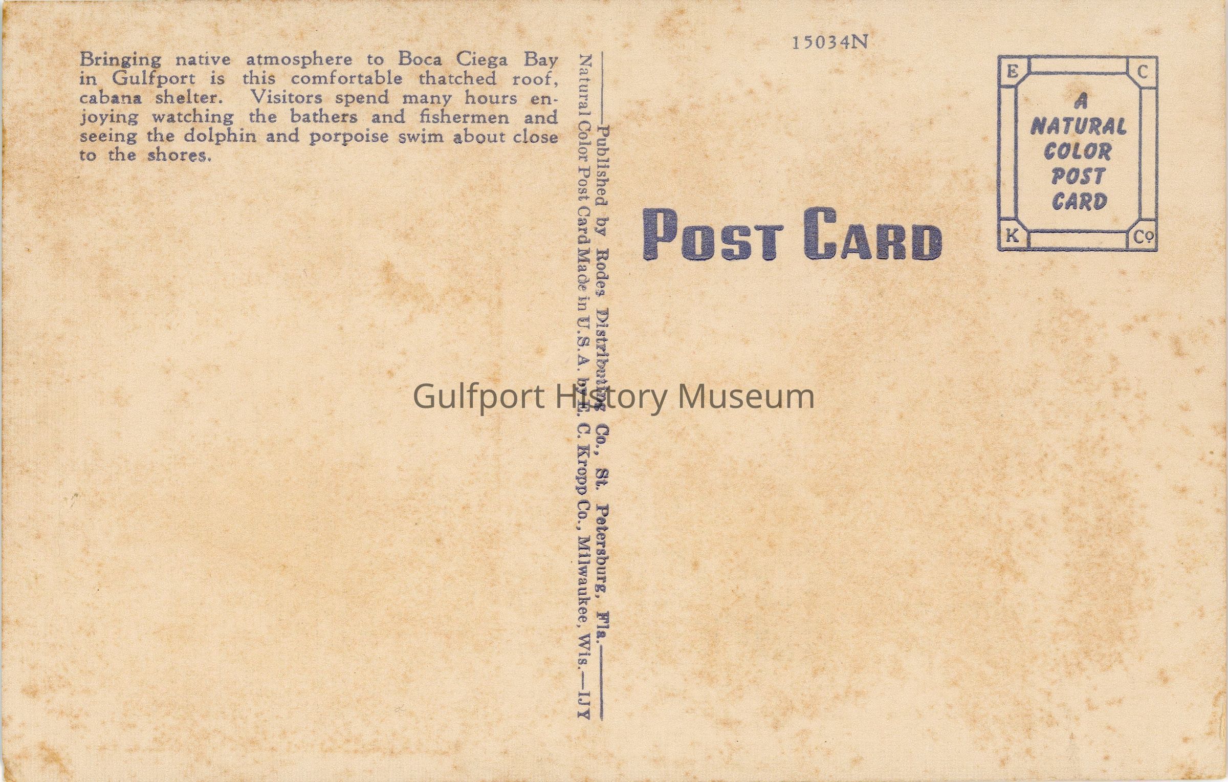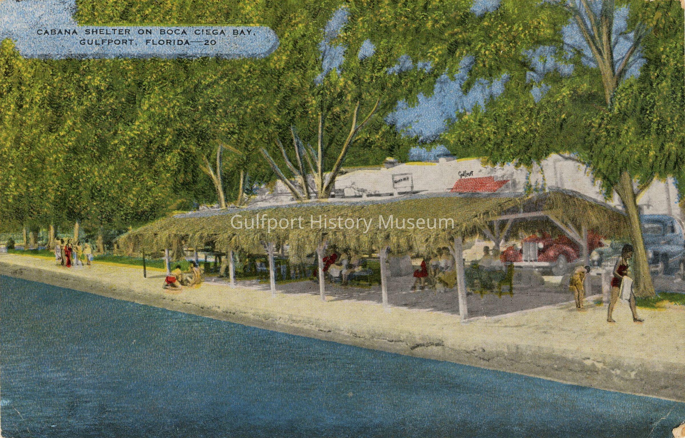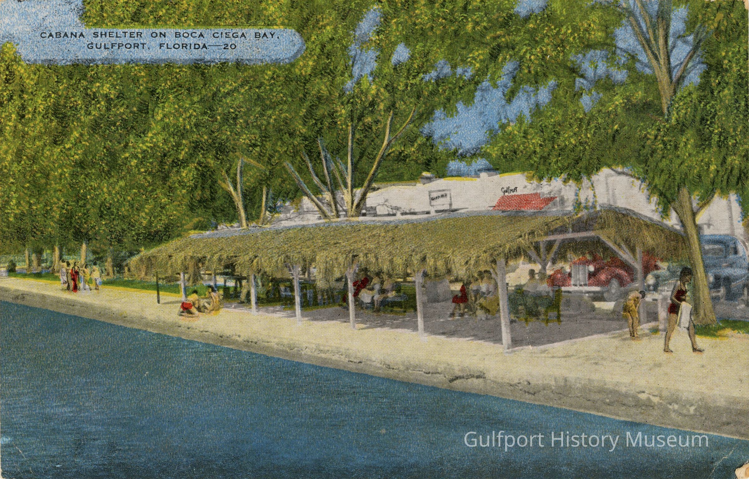 Bringing native atmosphere to Boca Ciega Bay / in Gulfport is this comfortable thatched roof, / cabana shelter. Visitors spend many hours en- / joying watching the bathers and fisherman and / seeing the dolphin and porpoise swim about close / to the shores.Transcriber