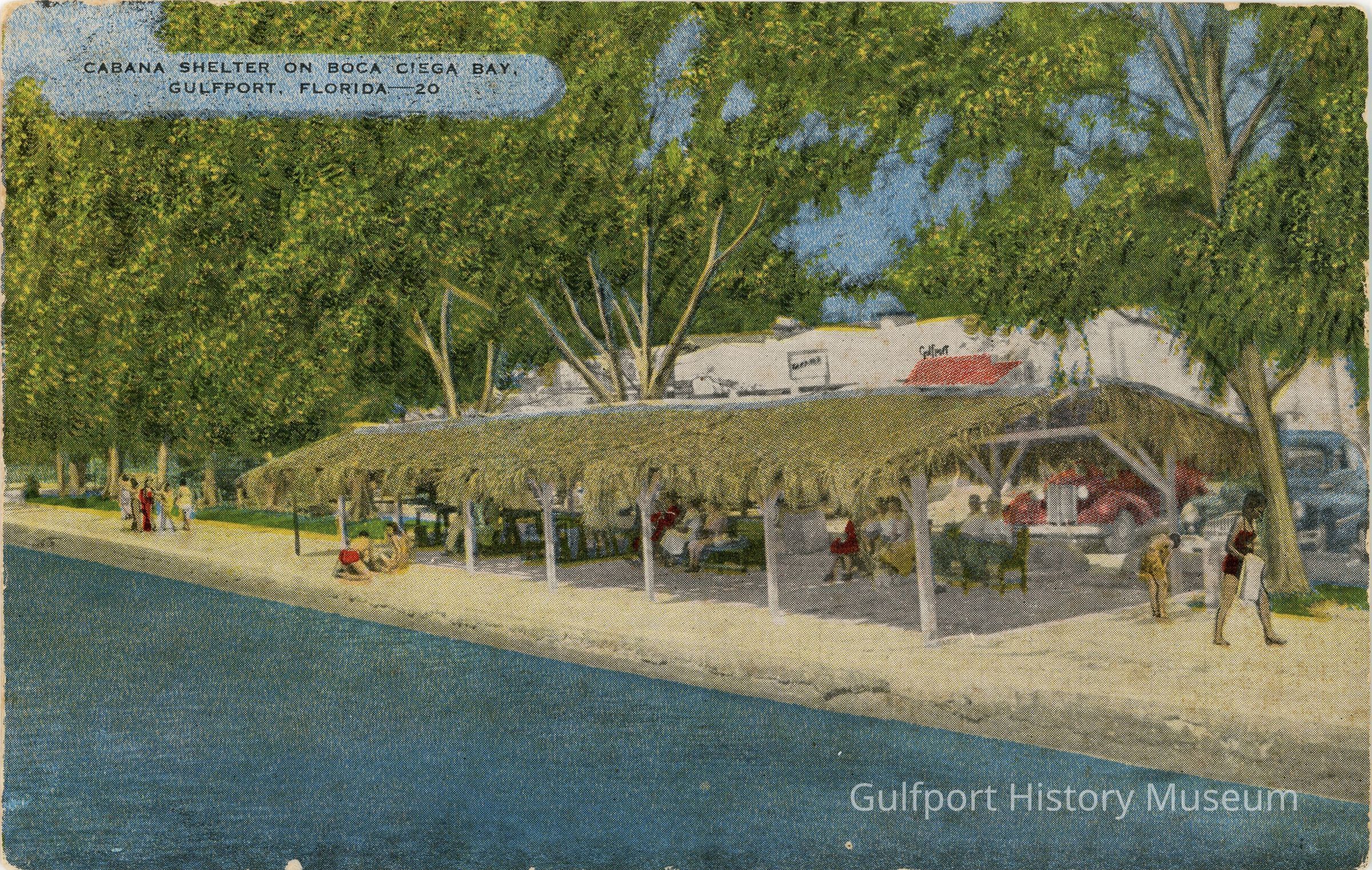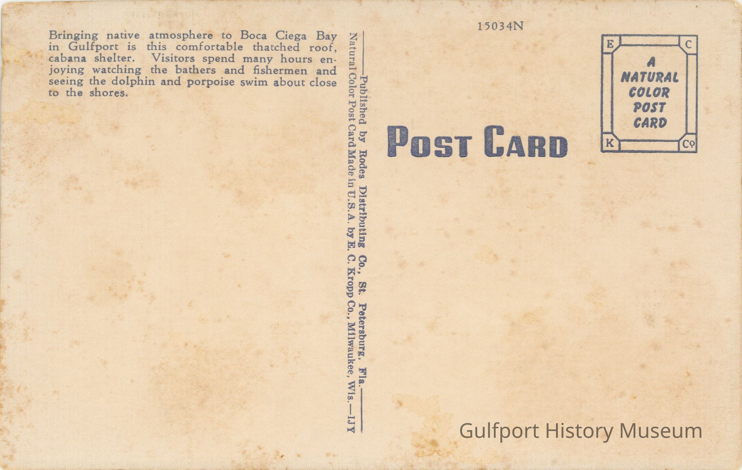 Bringing native atmosphere to Boca Ciega Bay / in Gulfport is this comfortable thatched roof, / cabana shelter. Visitors spend many hours en- / joying watching the bathers and fisherman and / seeing the dolphin and porpoise swim about close / to the shores.Transcriber
