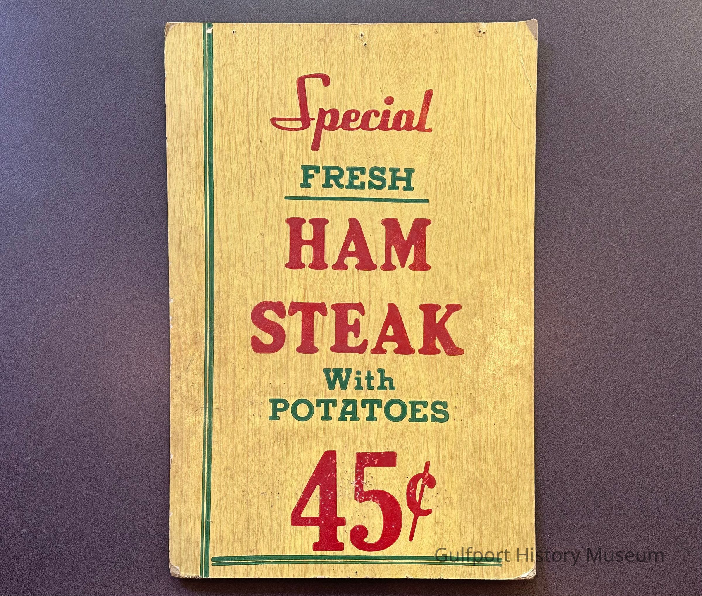 A yellow sign with green and red text that reads: "Special / FRESH HAM STEAK With POTATOES / 45c"