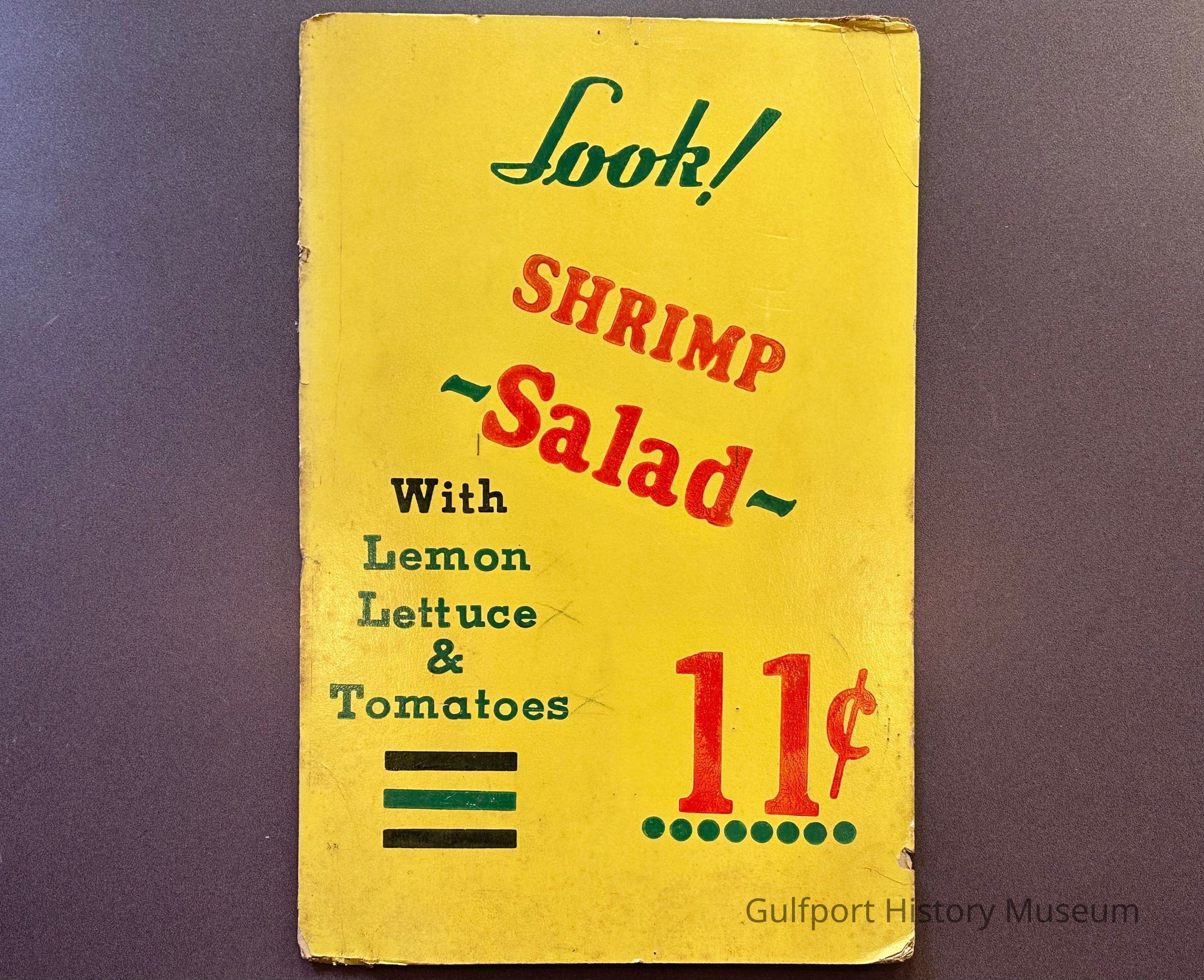 A yellow sign with green and red text that reads: "Look! / SHRIMP - Salad - With Lemon Lettuce & Tomatoes / 11c"