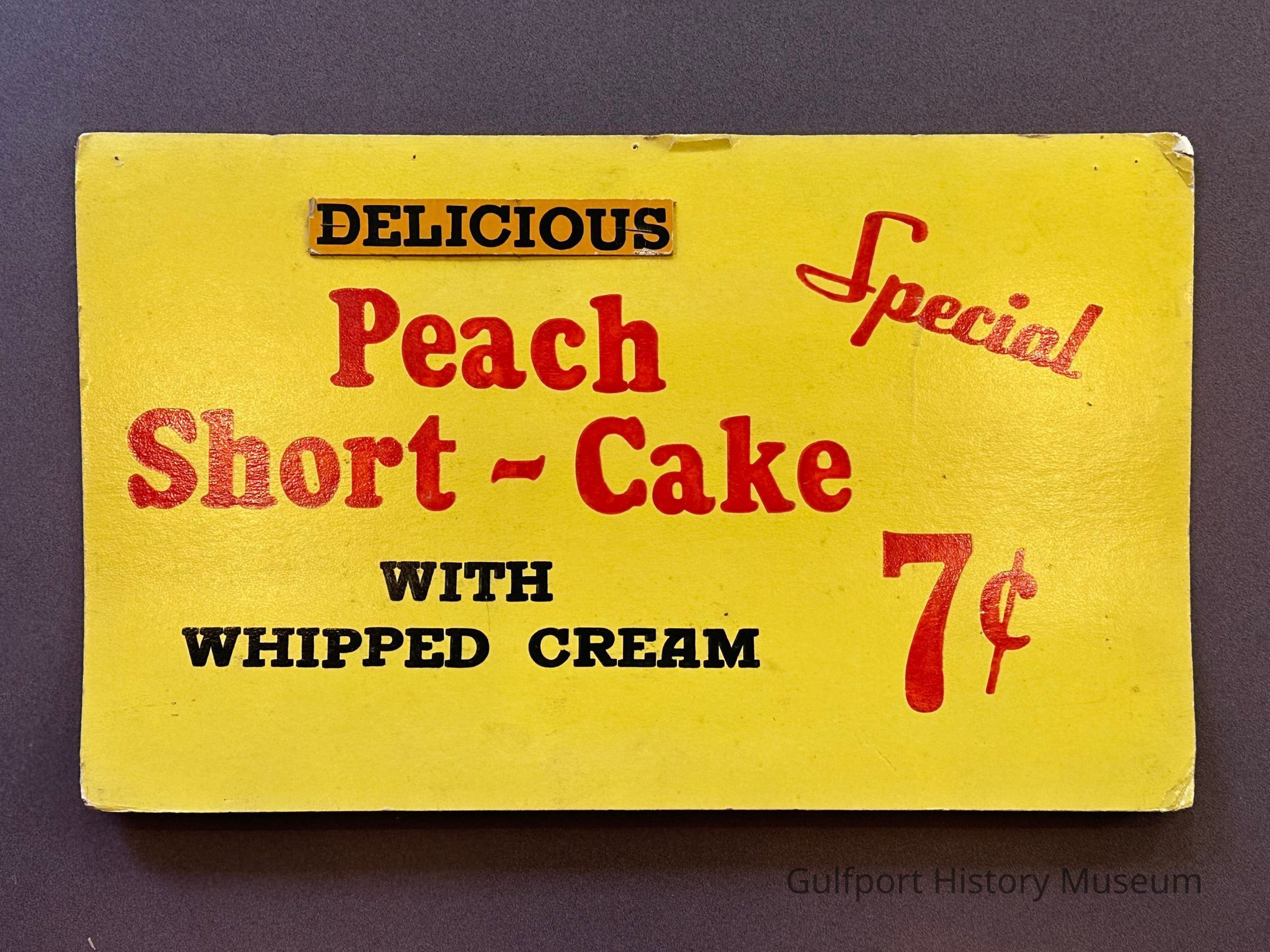 A yellow sign with black and red text that reads: "Special / DELICIOUS Peach Short - Cake WITH WHIPPED CREAM / 7c"