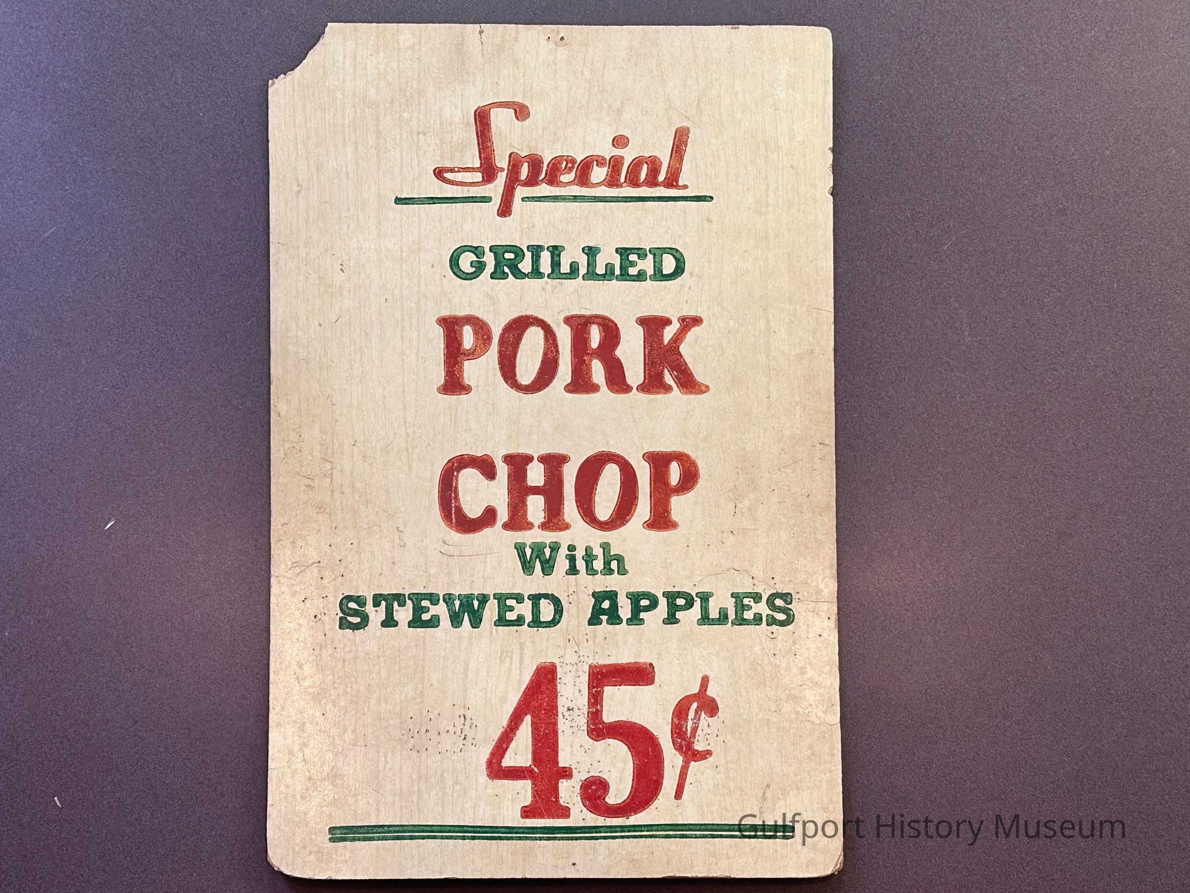 A white sign with green and red text that reads: "Special / GRILLED PORK CHOP With STEWED APPLES / 45c"