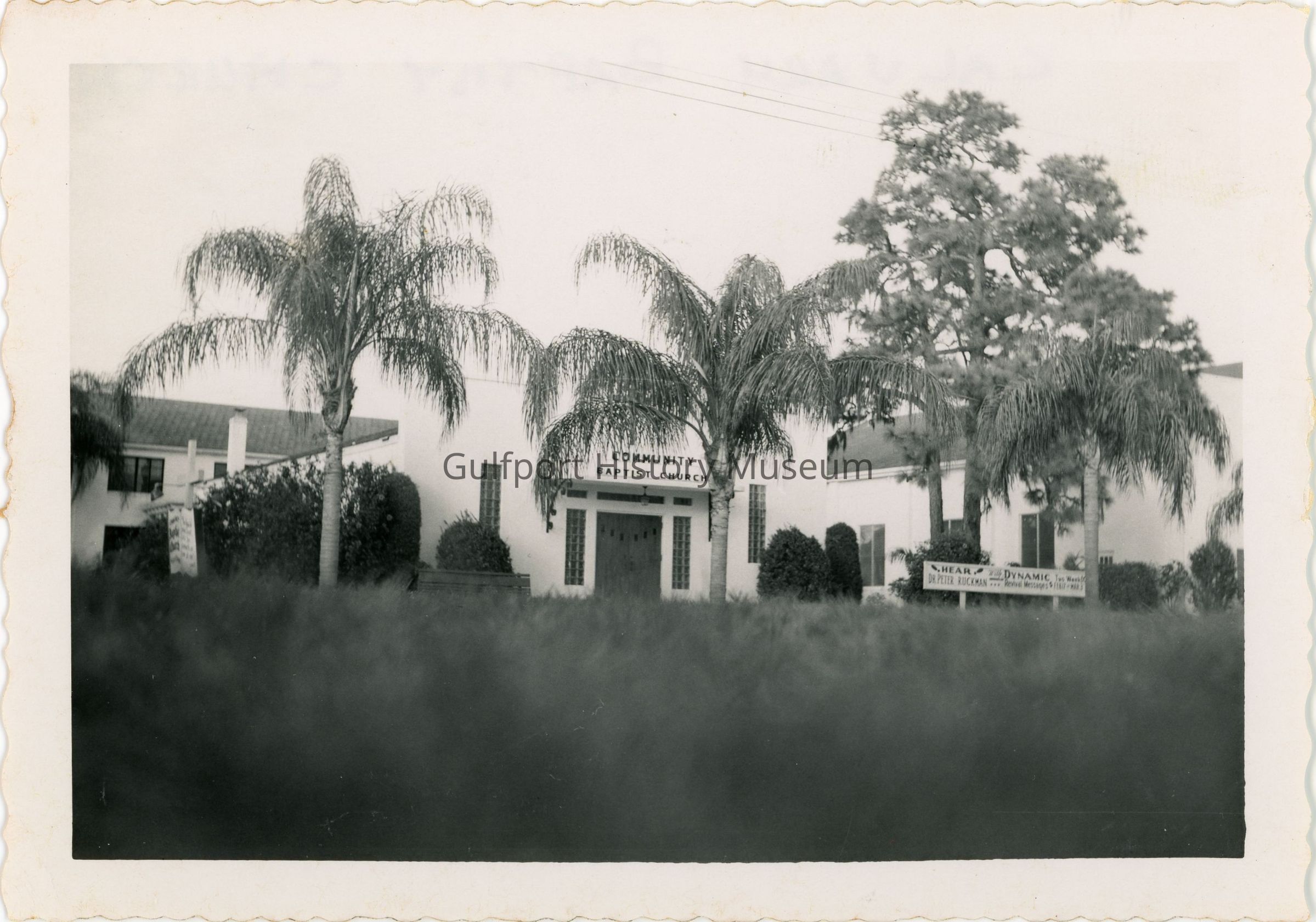 A black and white photograph of Calvary Baptist Church from ground level. The church is a white building. The words "COMMUNITY BAPTIST CHURCH" can be seen above the main entrance. The lawn is landscaped and has several palm trees. A small white sign reads, "!HEAR! DR. PETER RUCKMAN With DYNAMIC Revival Messages Two Weeks FEB 17 - MAR 3"