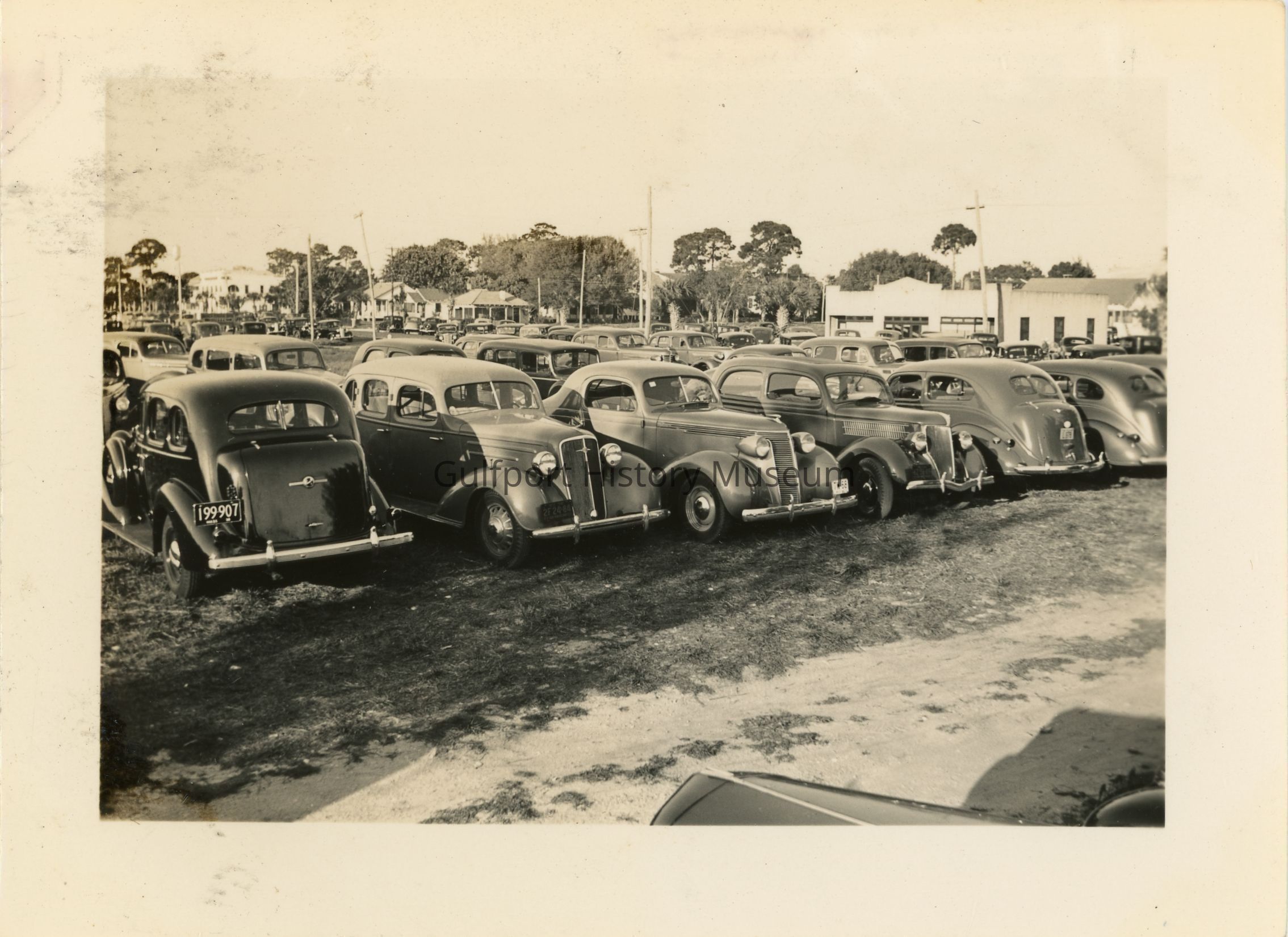 A black and white photograph of cars parked in an empty grass lot along Shore Blvd. Beach Blvd and some of its buildings are visible in the background.