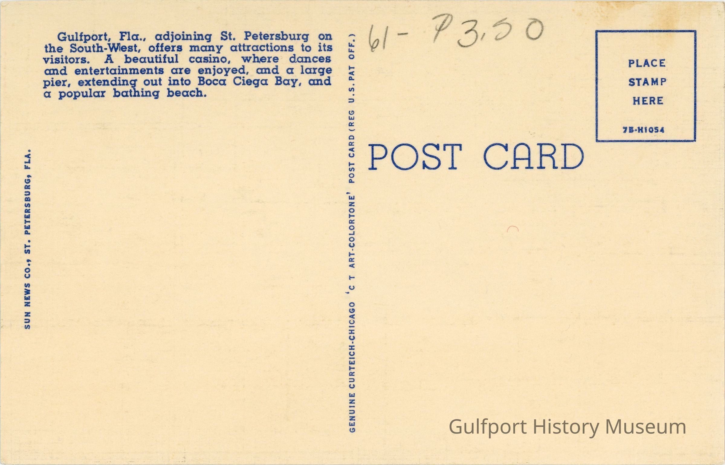 Gulfport, Fla., adjoining St. Petersburg on / the South-West, offers many attractions to its / visitors. A beautiful casino, where dances / and entertainments are enjoyed, and a large / pier, extending out into Boca Ciega Bay, and / a popular bathing beach. / 61 - P ($?) 3.50Transcriber
