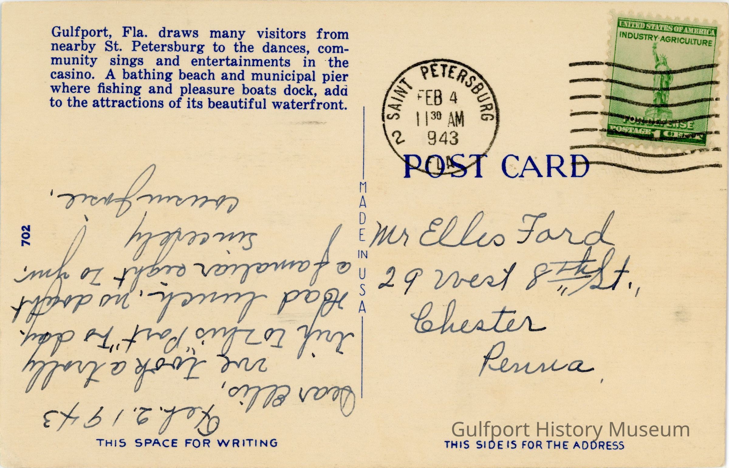 Gulfport, Fla. draws many visitors from /nearby St. Petersburg to the dances, com- / munity sings and entertainments in the / casino. A bathing beach and municipal pier / where fishing and pleasure boats dock, add / to the attractions of its beautiful waterfront. / Feb. 2. 1943 / Dear Ellis, / We took a trolly [sic] / trip to this "Port" today. / Had lunch, no doubt / a famaliar [sic] sight to you. / Sincerely / Cousin JosieTranscriber