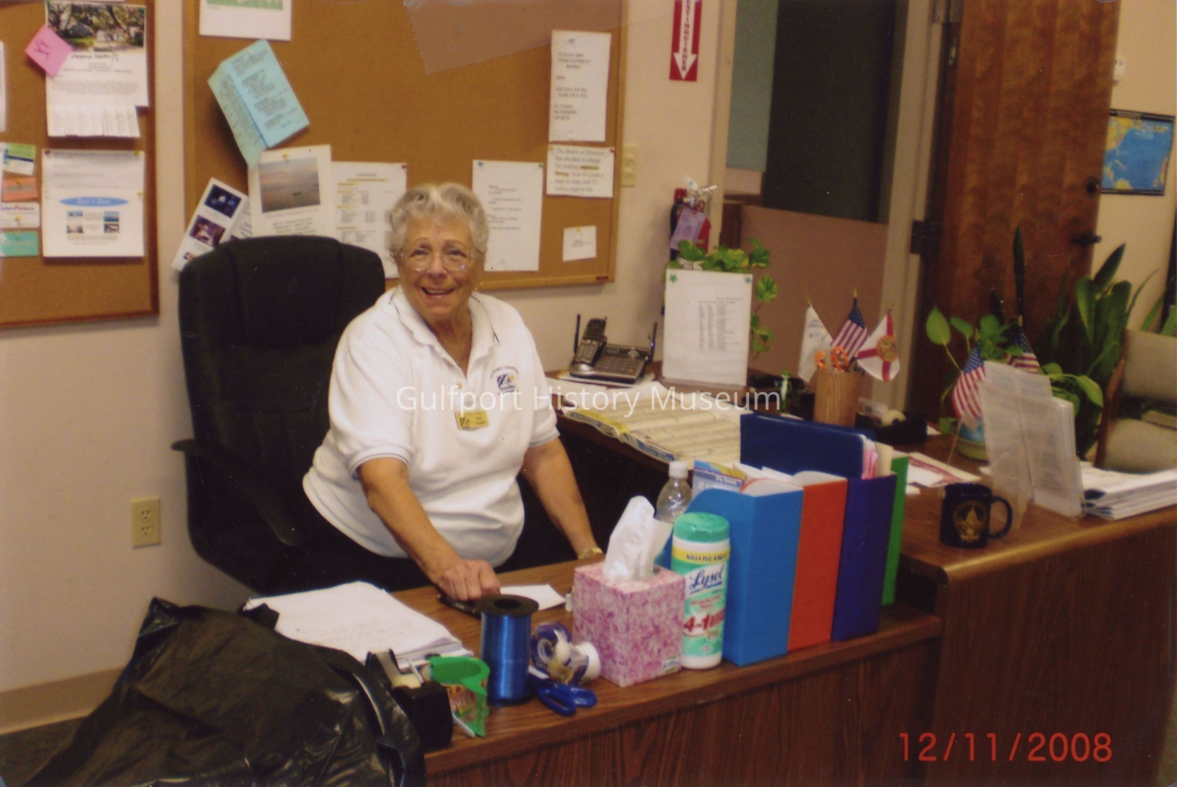 A color photograph of a woman sitting at a desk in the Chamber of Commerce office. She wears a name tag and a Gulfport Chamber of Commerce shirt. There is a large book (city directory?) open in front of her and color binders along the other edge of the desk. There are various small flags in cups. Two cork boards are hanging on the wall behind her.