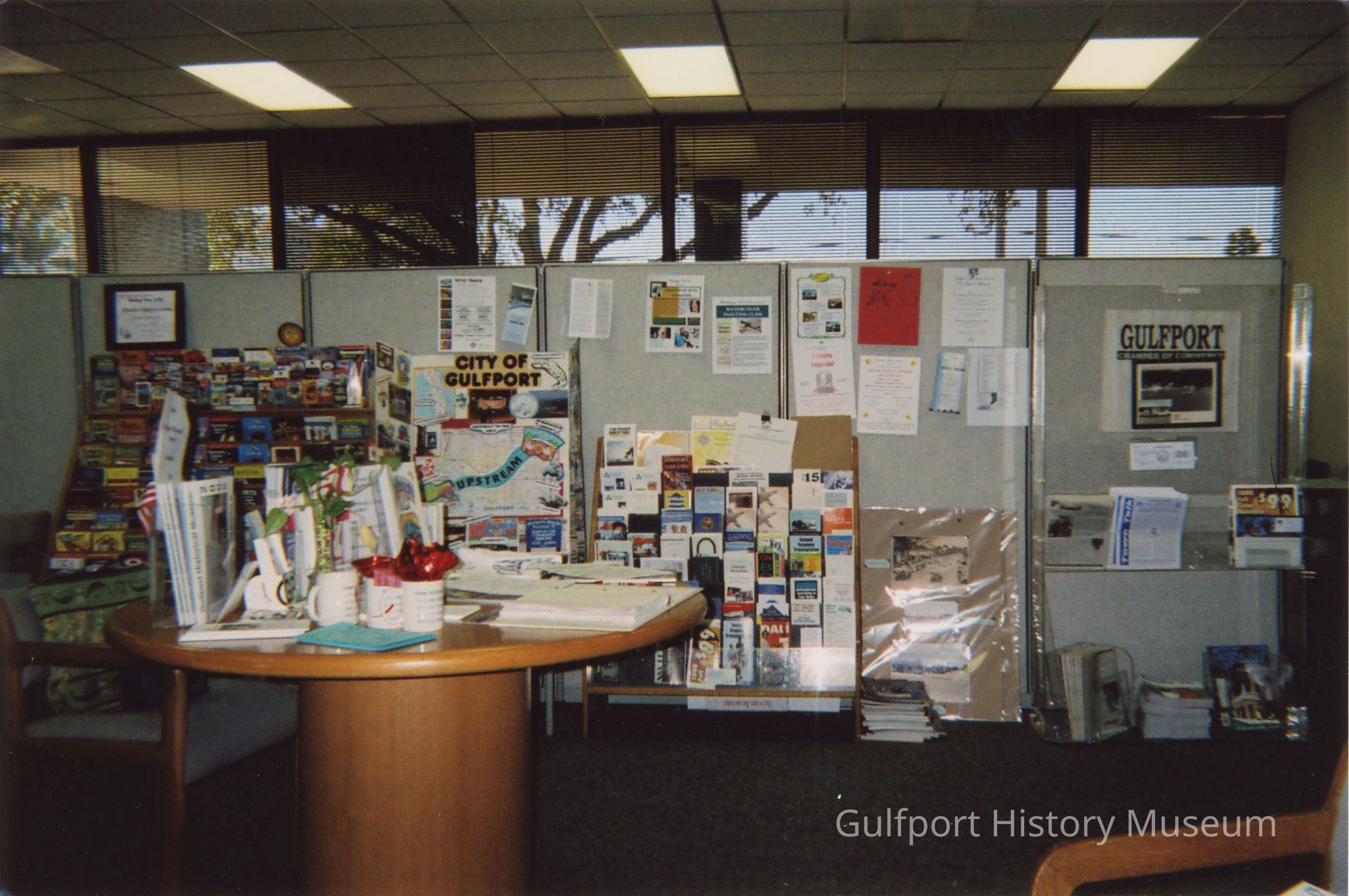 A color photograph of the Chamber of Commerce office. The room has a circular table full of papers and mugs. There are temporary walls and stands behind the table filled with brochures and posters.