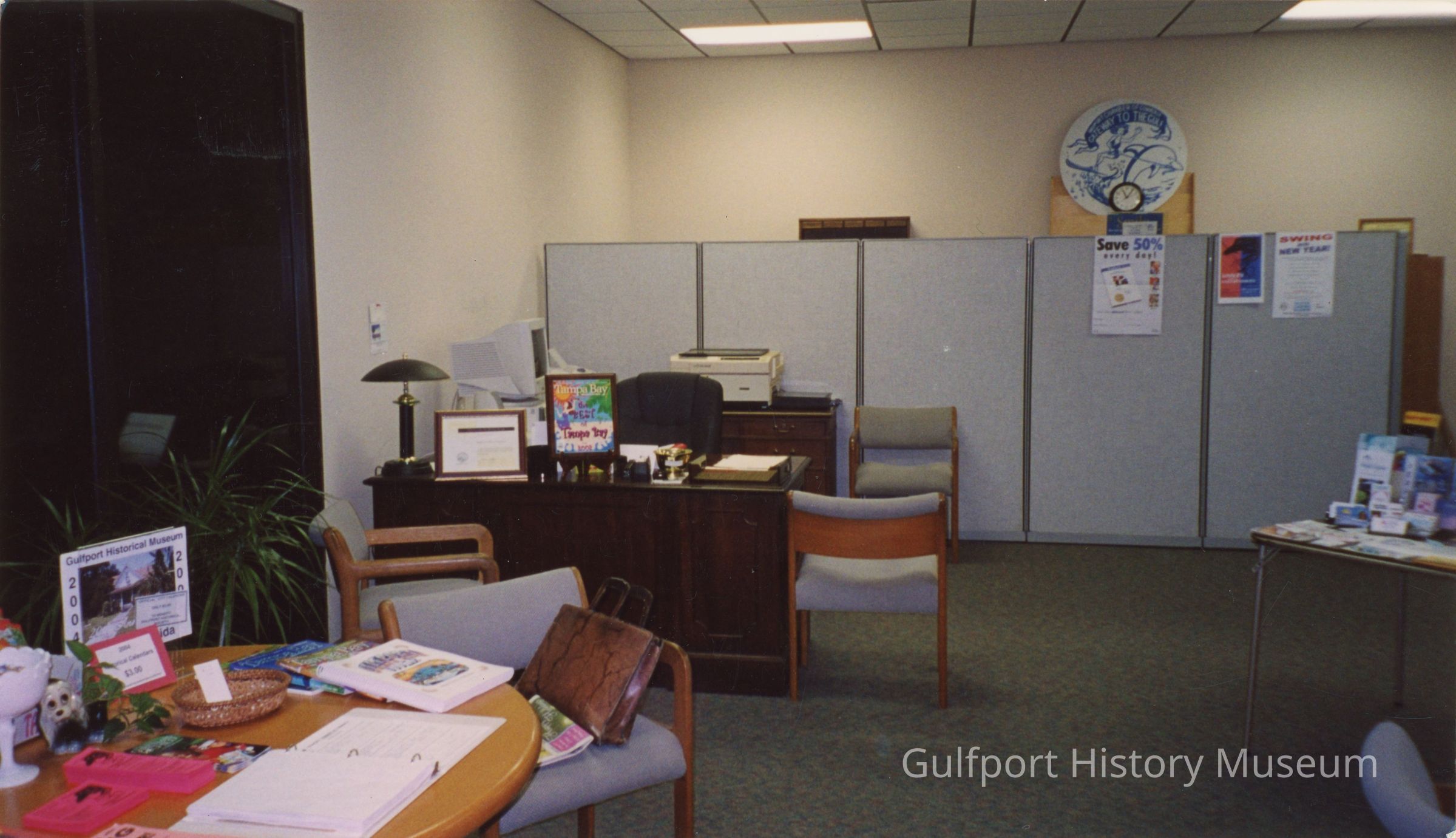 A color photograph of the Chamber of Commerce office. The room is filled with desk and tables with pamphlets and other materials. A copy of the 2004 Gulfport Historical Museum calendar is visible on a table left of frame. The back of the room is partially covered with a partition wall.