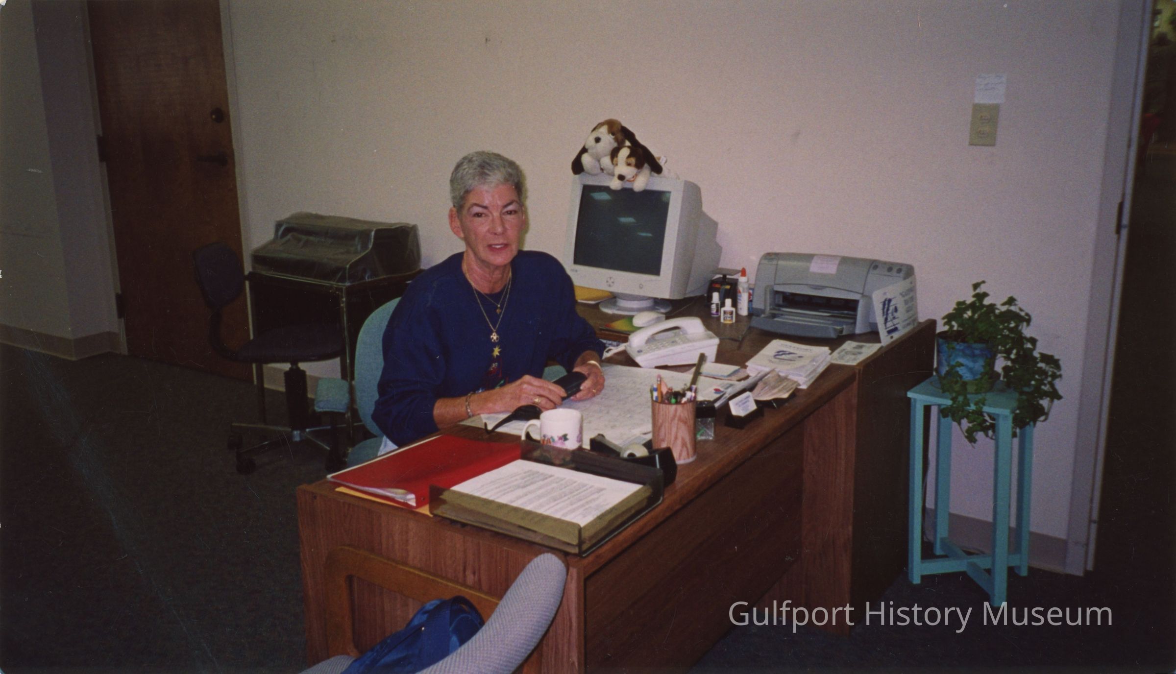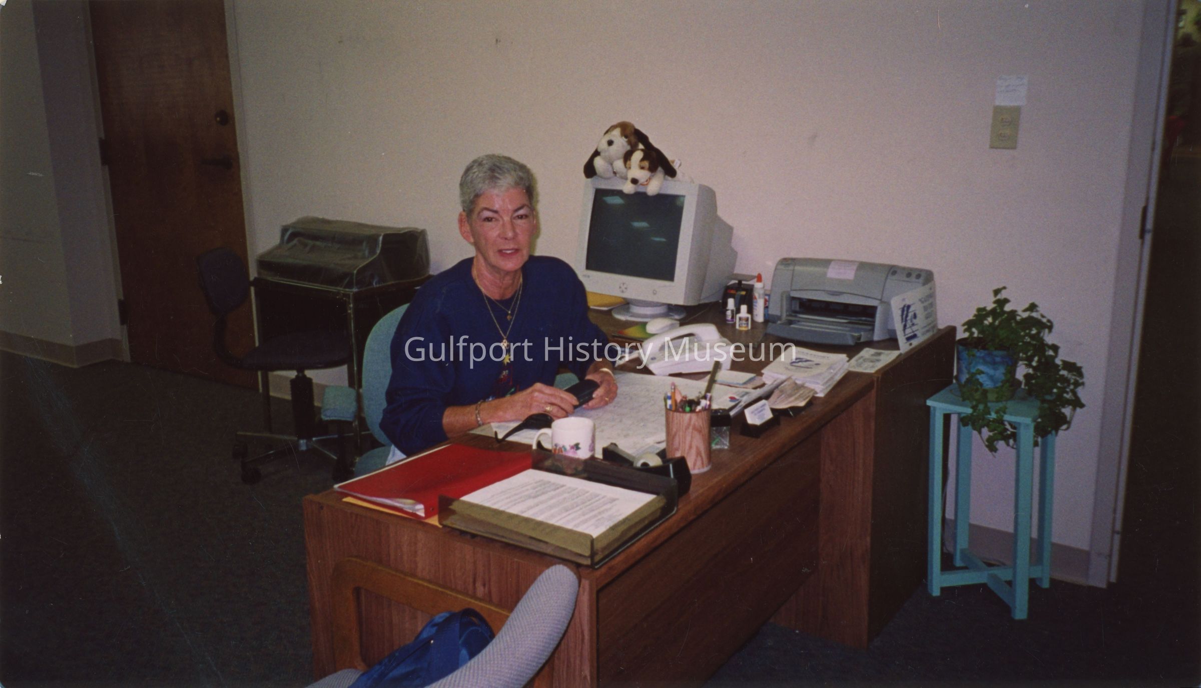 A color photograph of a woman sitting at a desk in the Chamber of Commerce office (?). There are two stuffed dogs on top of a computer monitor next to a printer. Office supplies are spread out along the desk. There is a typewriter and chair behind her.