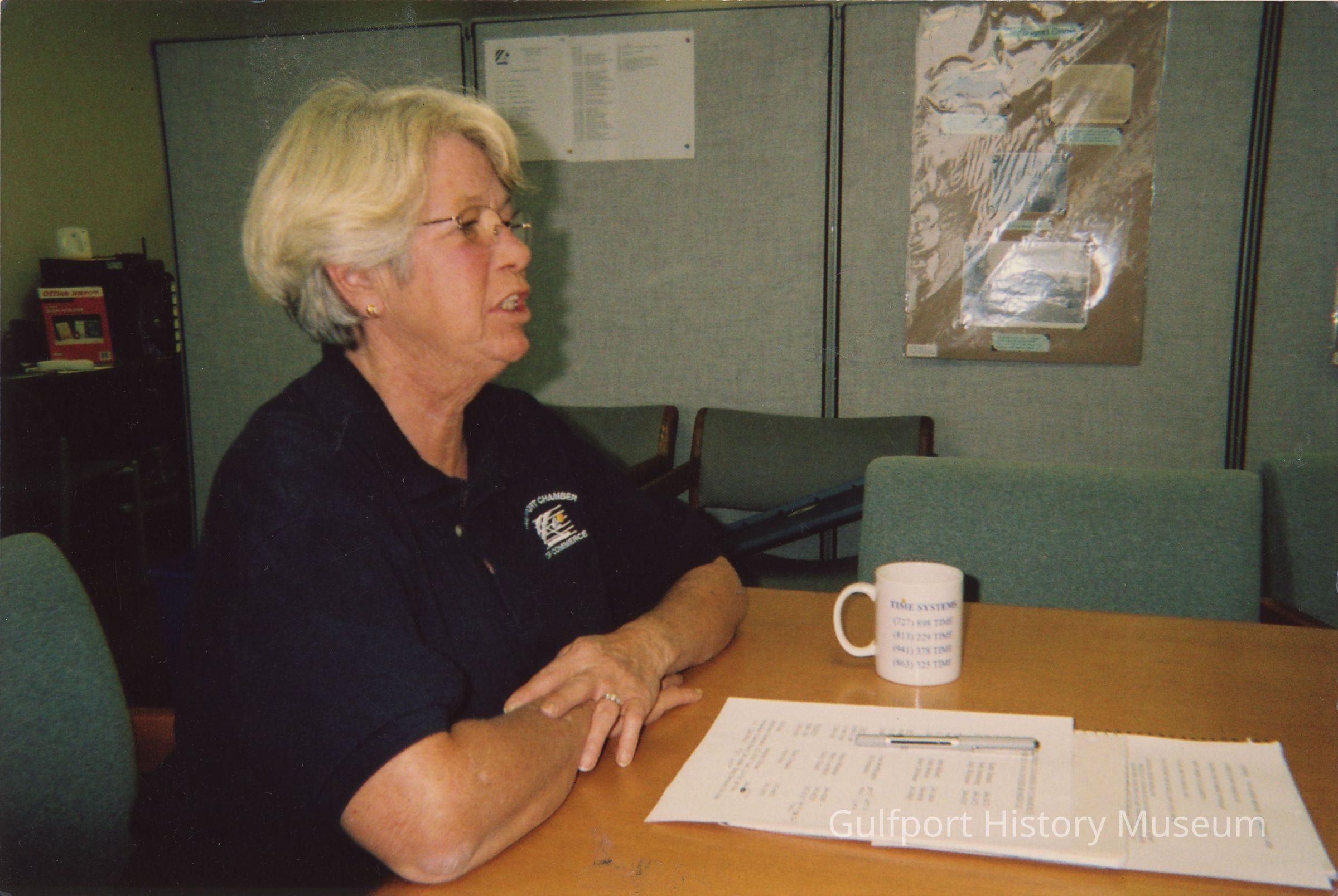 A color photograph of a woman sitting at a wooden conference table with a mug, papers, and a pen with her arms crossed on the table. She wears a Gulfport Chamber of Commerce shirt. There is a temporary dividing wall with papers and a poster hung to her side.