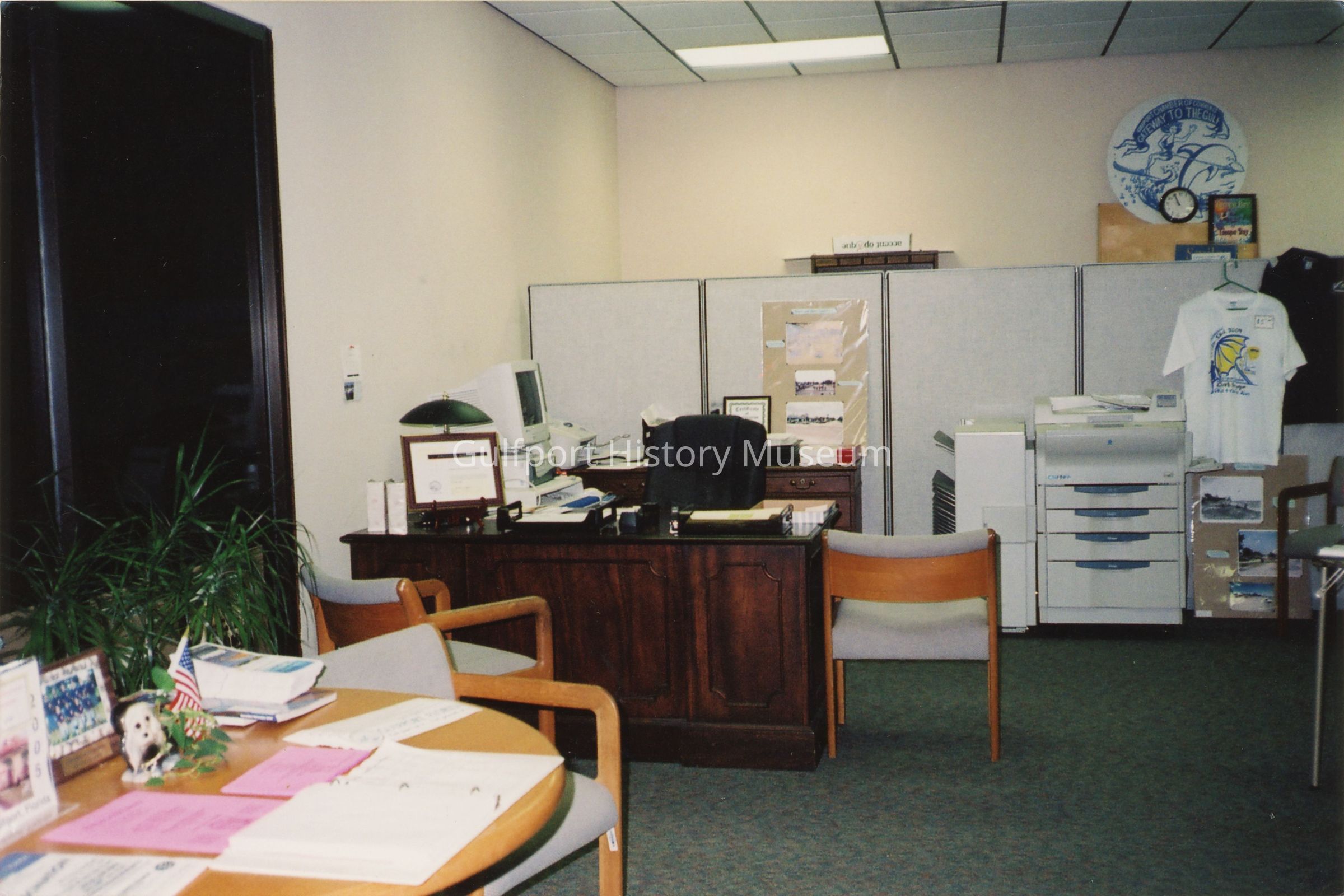 A color photograph of the Chamber of Commerce office. The office has a dark wood desk and temporary walls behind it. There is a white circular sign with blue ink and a dolphin which reads "GATEWAY TO THE GULF." There is a round light wood table in the foreground with chairs scattered. There is a Chamber of Commerce Fun Run shirt hanging on one of the temporary walls by a printer.