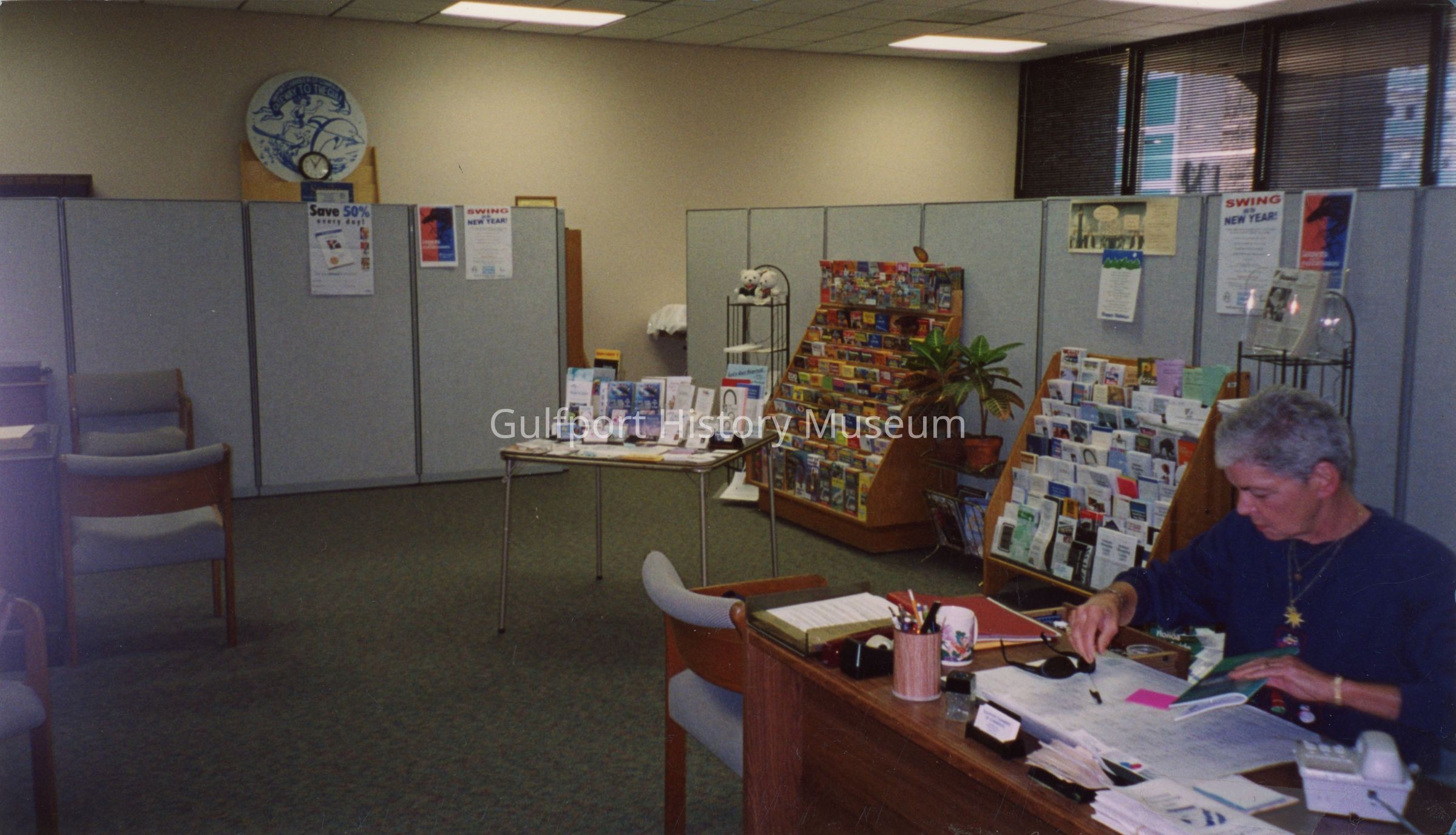 A color photograph of the Chamber of Commerce office. Brochures and pamphlets are in stands by a temporary wall. A white sign with blue ink reading "GATEWAY TO THE GULF" hangs on the wall. There is a woman sitting at the reception desk in the foreground.