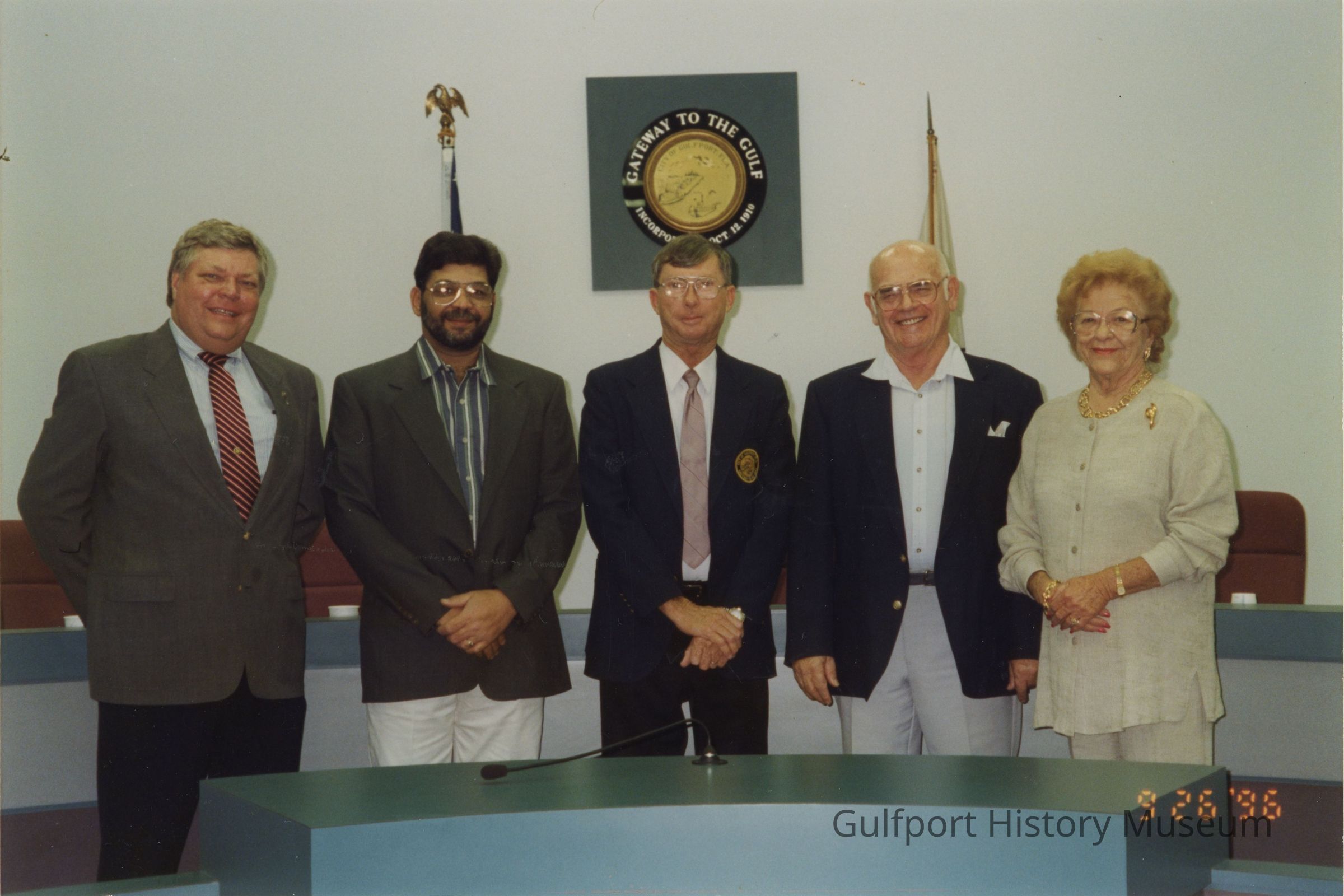 A color photograph of Gulfport City Council in 1996. From left to right, Jack Olsen, Larry Cooper, Mayor Mike Yakes, Ted Phillips, and Colleen Camp standing in front of two flags and the seal of Gulfport.