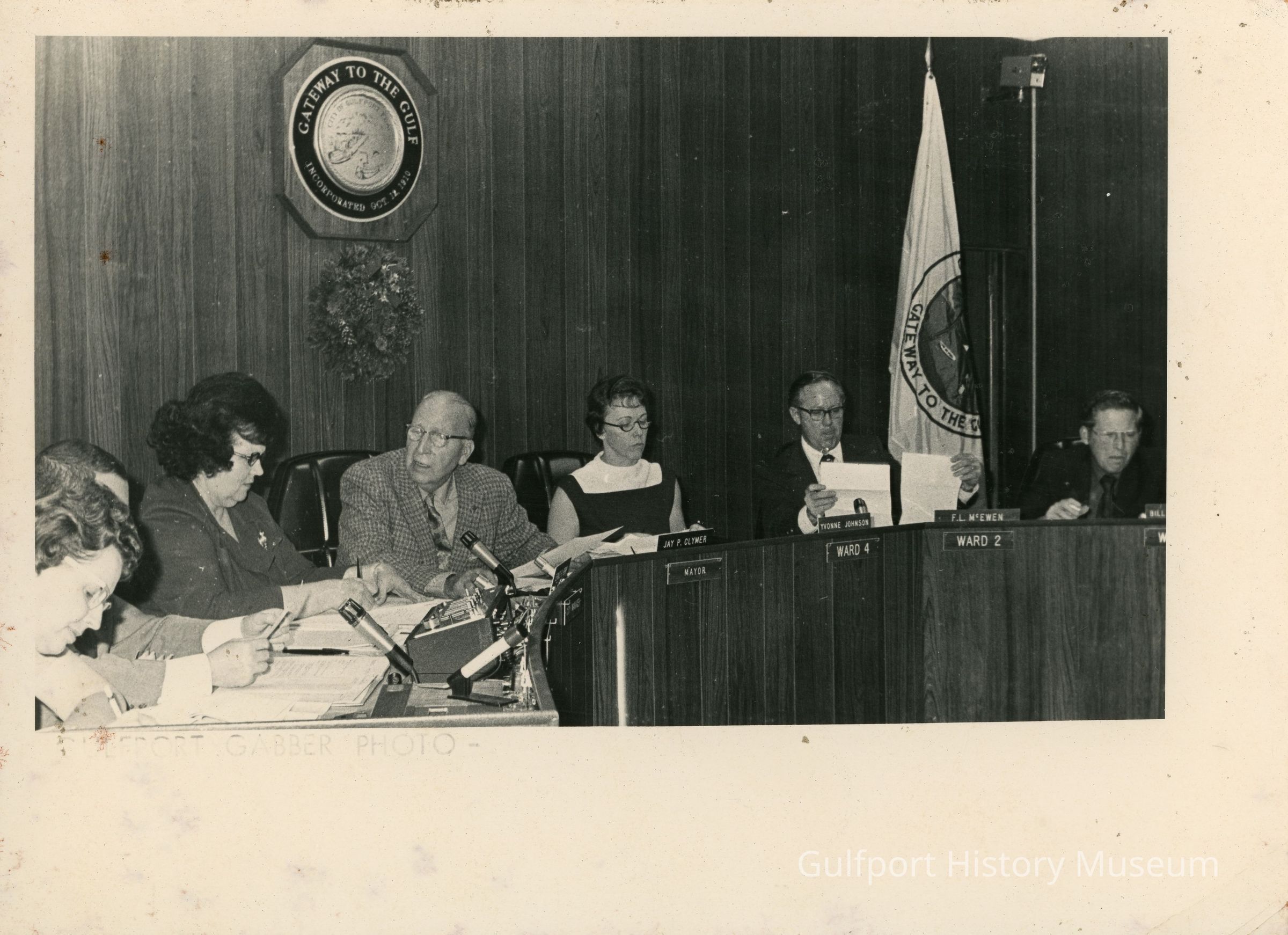 A black and white photograph of Gulfport City Council. [Mayor Jay Clymer, and Councilmembers Yvonne Johnson, Leslie McEwen, William Brokaw], and three others sit at the chamber desk. Both the seal of Gulfport and the flag of Gulfport are visible behind them.