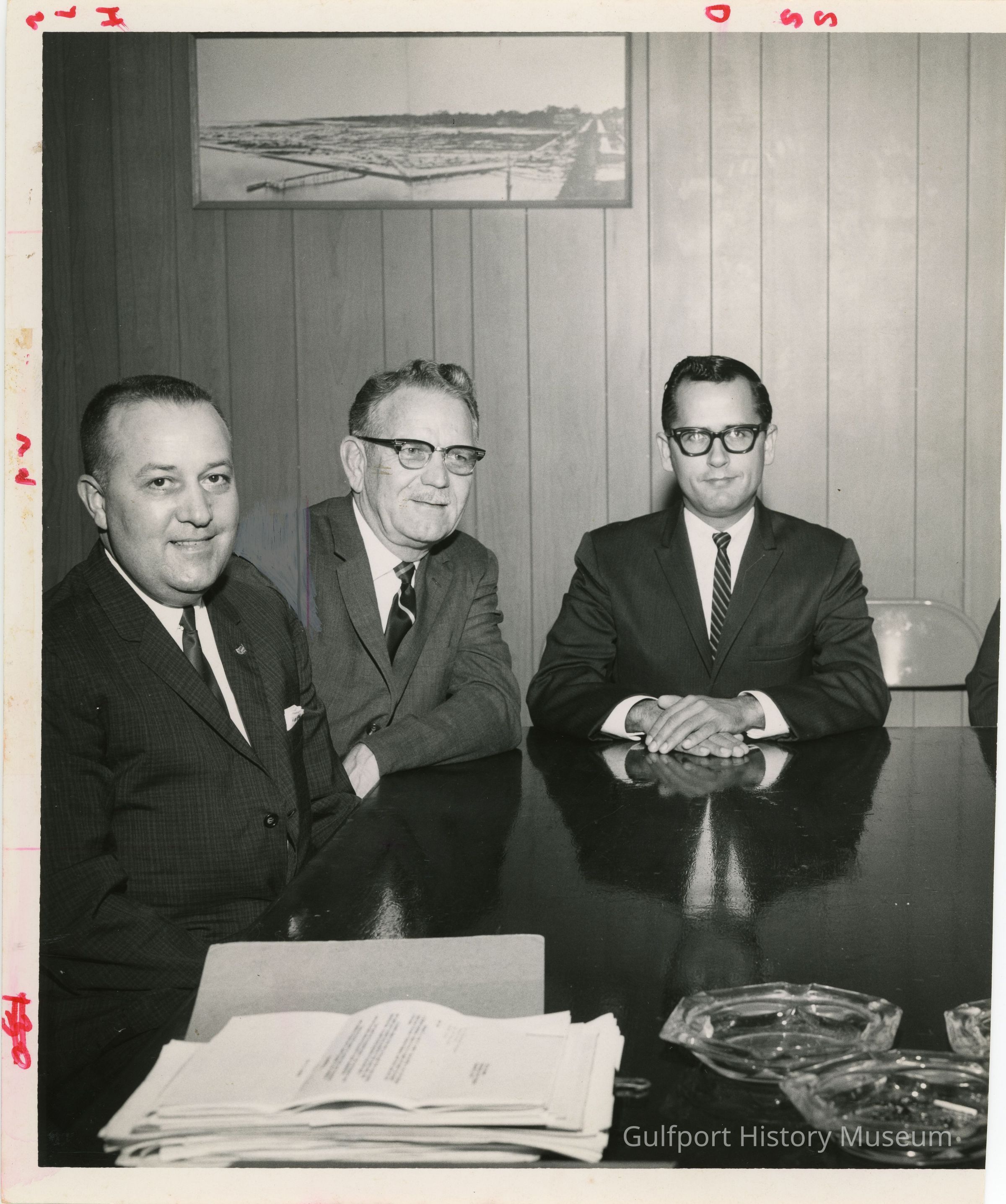 A black and white photograph of two members of the Gulfport City Council and Mayor John T. Robinson sitting at a table at City Hall. All three men are wearing suits and ties. The photographer has begun to manually edit out the right arm of the man in the middle. A photograph hangs on the wood panel wall behind them.
