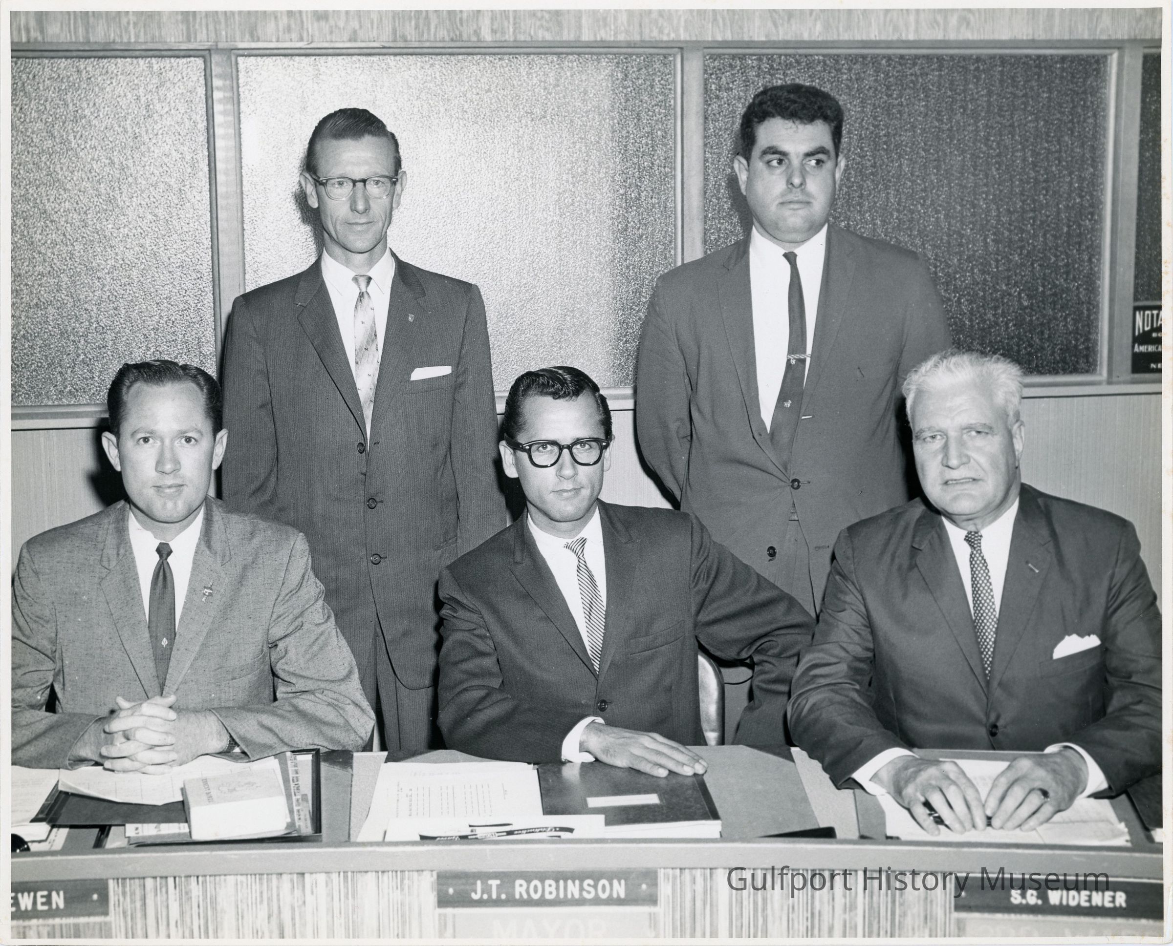 A black and white photograph of five members of City Council, including [soon-to-be/then] Mayor John T. Robinson seated in the center. All men are wearing suits. The nameplates read "McEWEN," "J.T. ROBINSON," and "S.G. WIDENER."