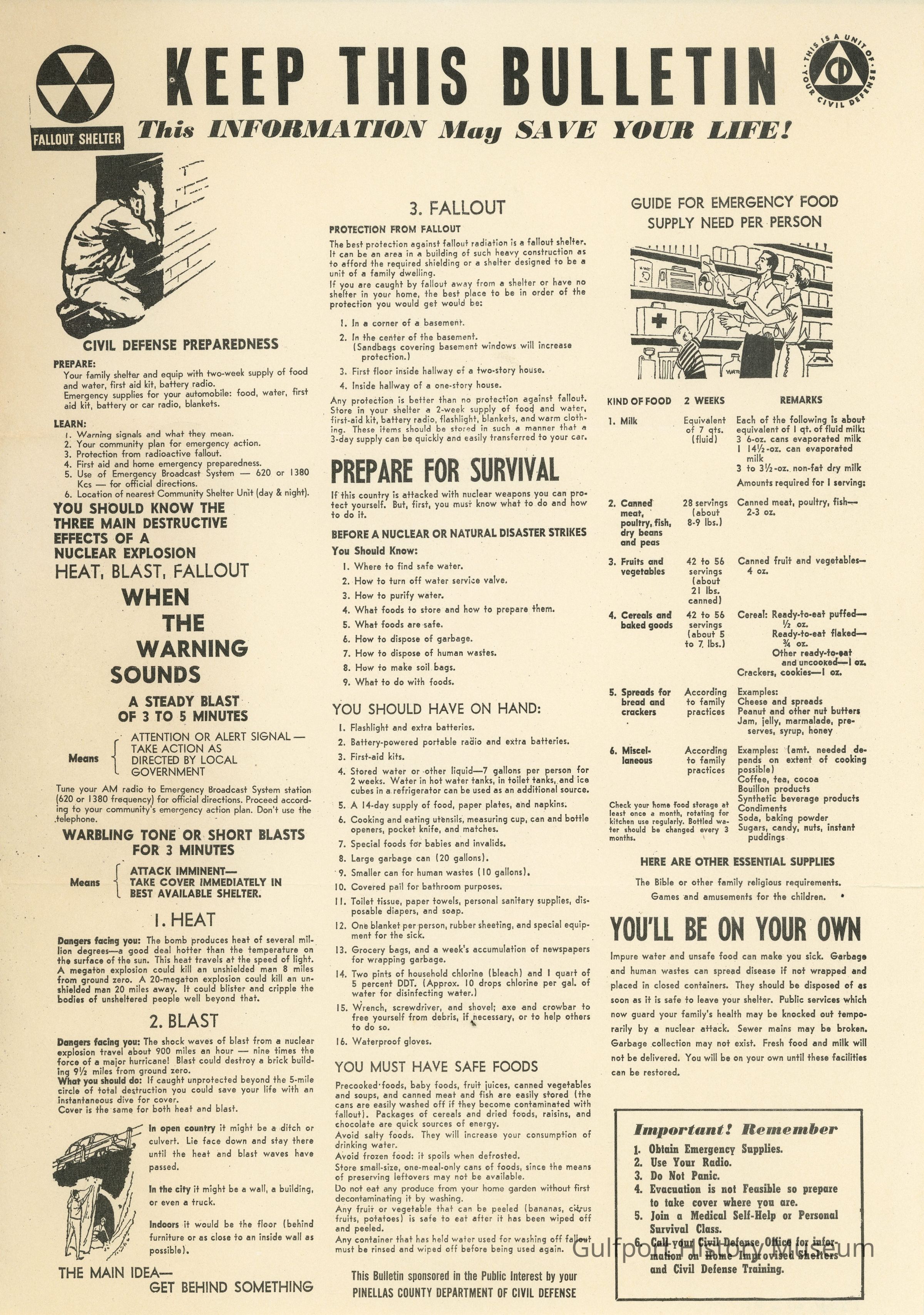 Dangers facing you: The bomb produces heat of several million degrees—a good deal hotter than the temperature on the surface of the sun. This heat travels at the speed of light. A megaton explosion could kill an unshielded man 8 miles from ground zero. A 20-megaton explosion could kill an unshielded man 20 miles away. It could blister and cripple the bodies of unsheltered people well beyond that.