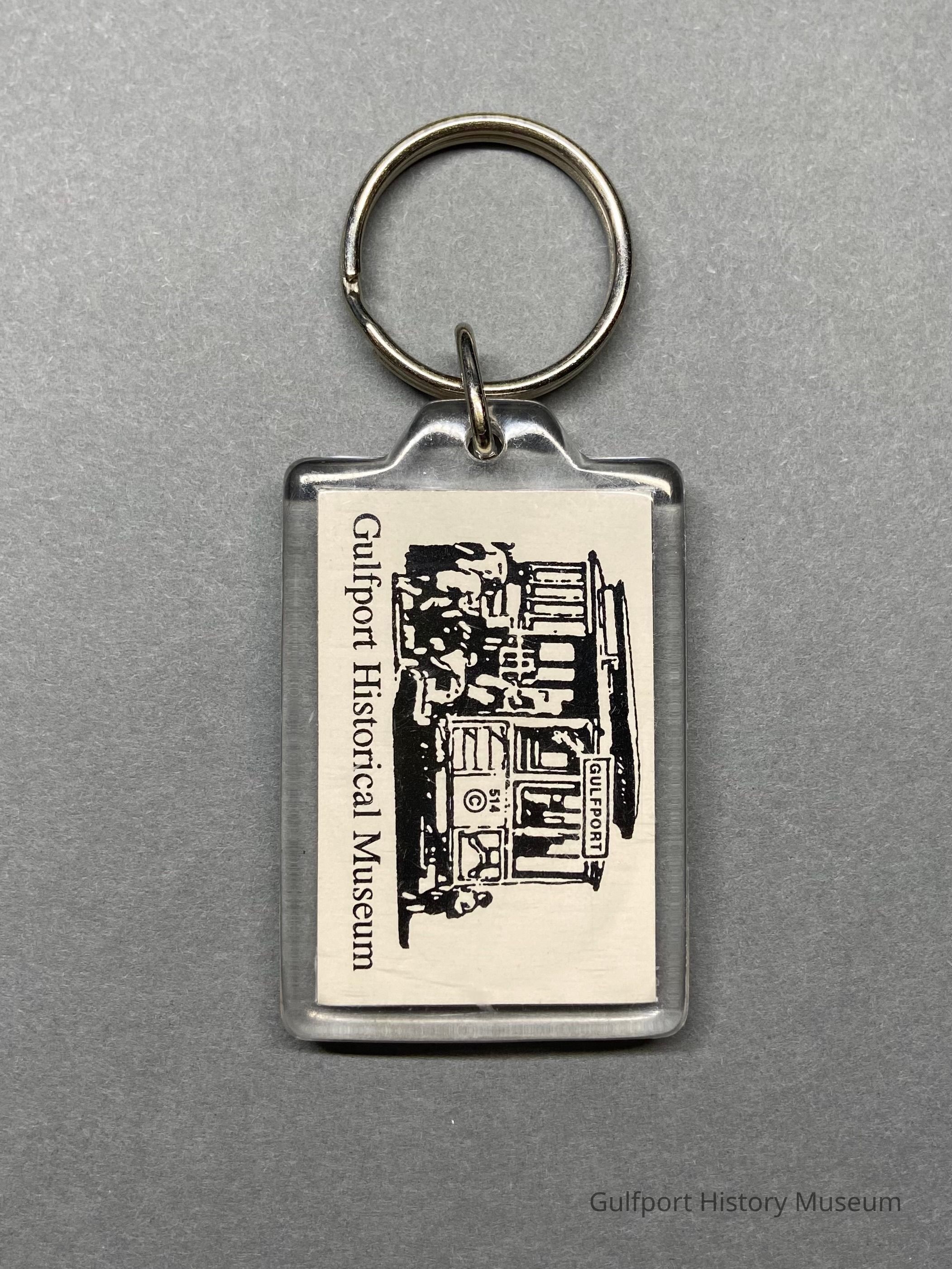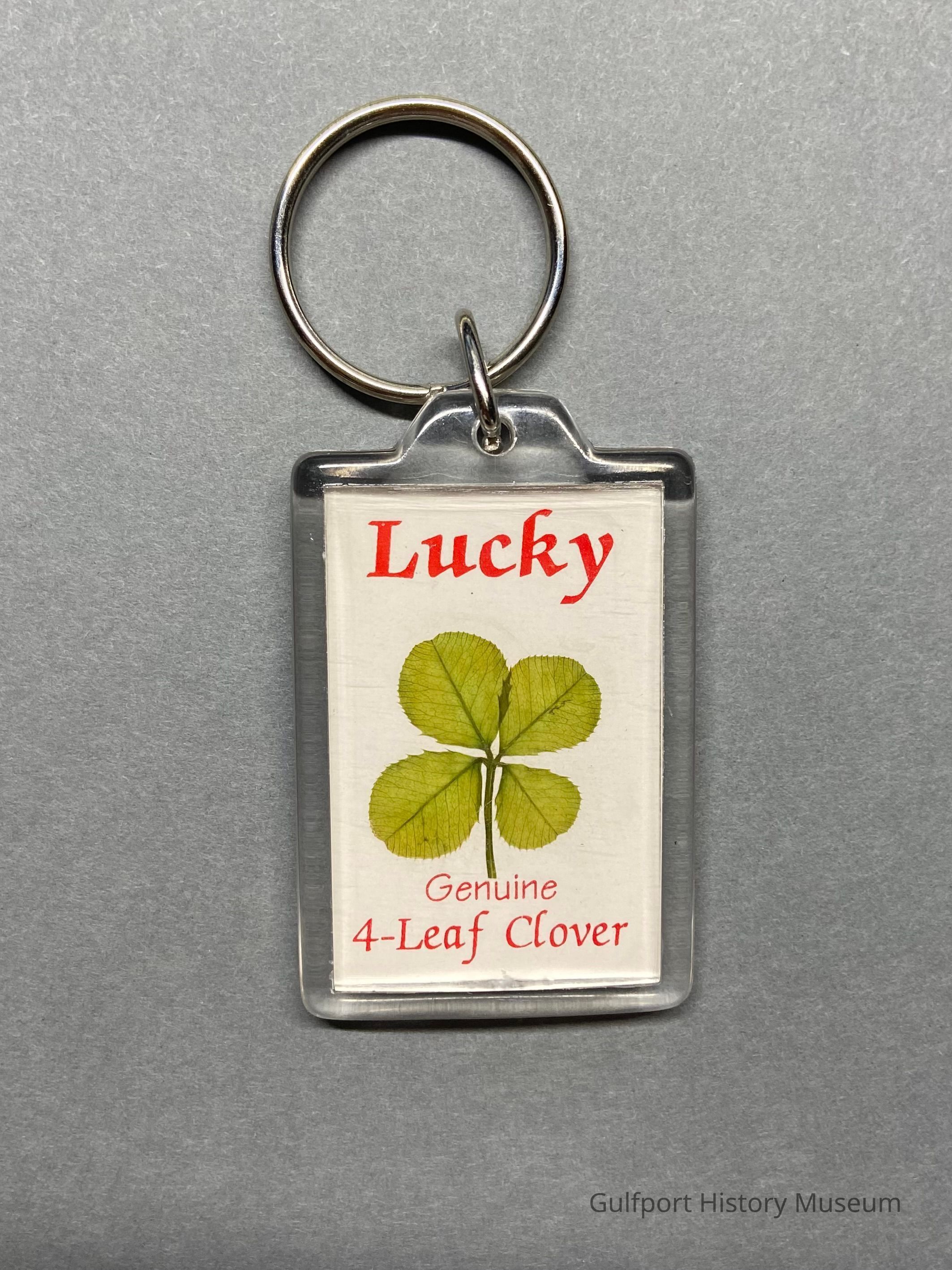 A Clover Specialty Company rectangular acrylic keychain with ring. Contains a real, preserved four-leaf clover inlaid under the acrylic frame . Clover side reads "Lucky Genuine 4-Leaf Clover." Reverse features the original Gulfport Historical Museum logo with trolley.