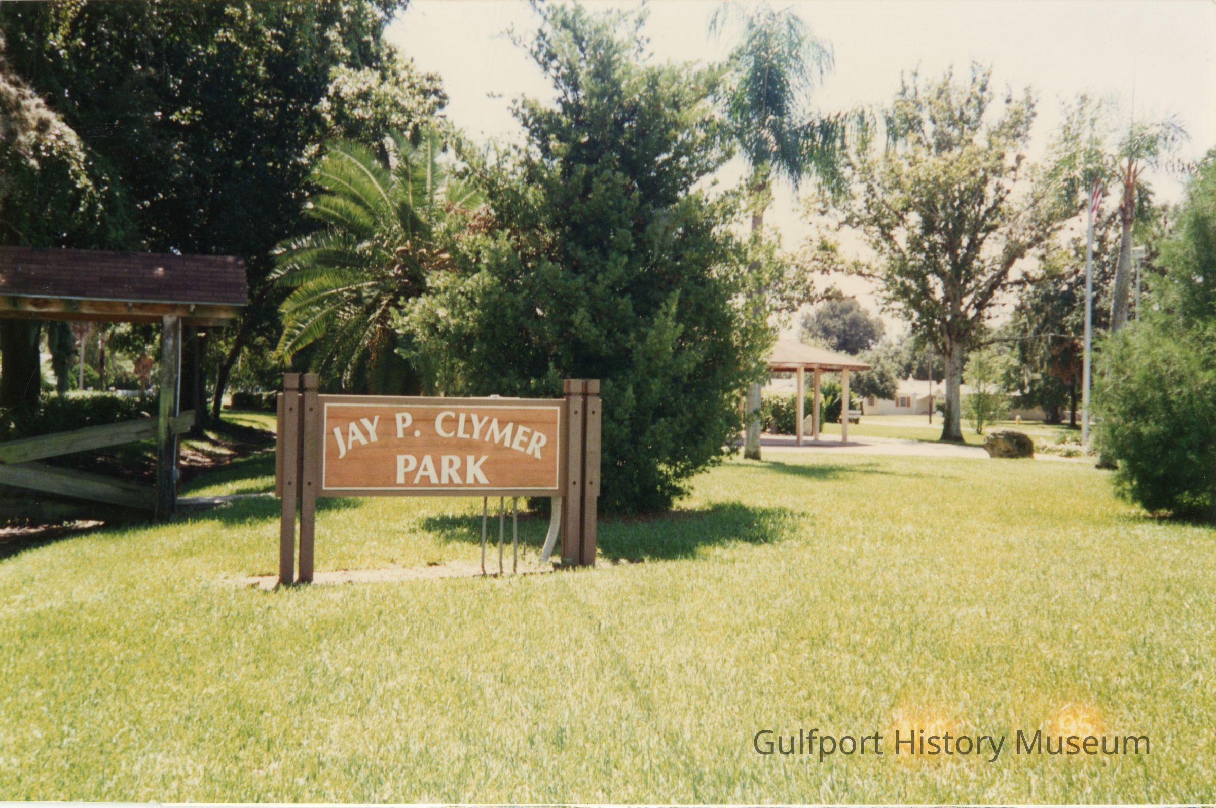 A color photograph of Clymer Park facing south from Gulfport Blvd. There is a large wooden sign which reads "JAY P. CLYMER PARK" in front of a short pine tree. A small covered bridge can be seen left of frame. A small, circular pavilion is visible in the distance.