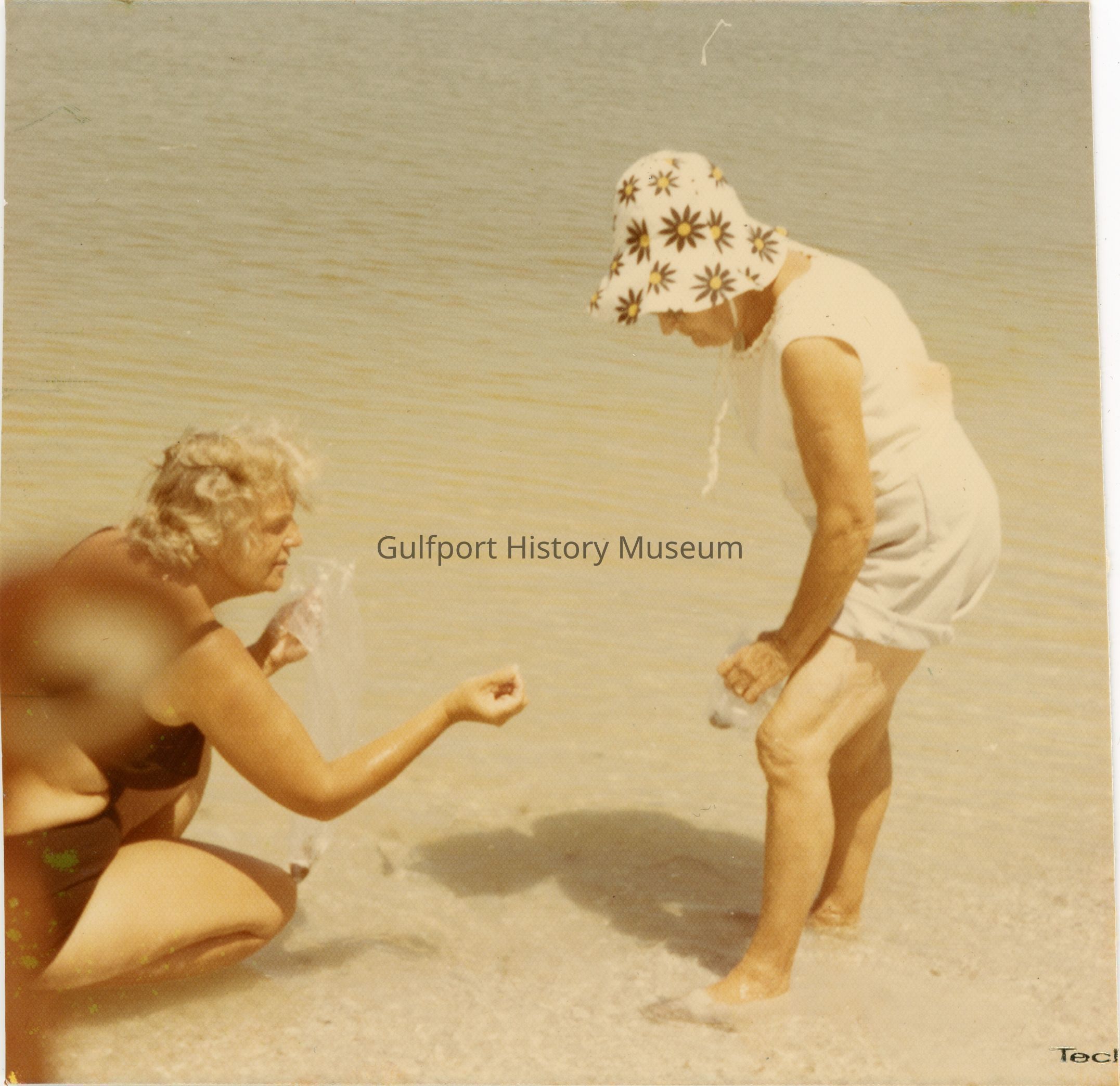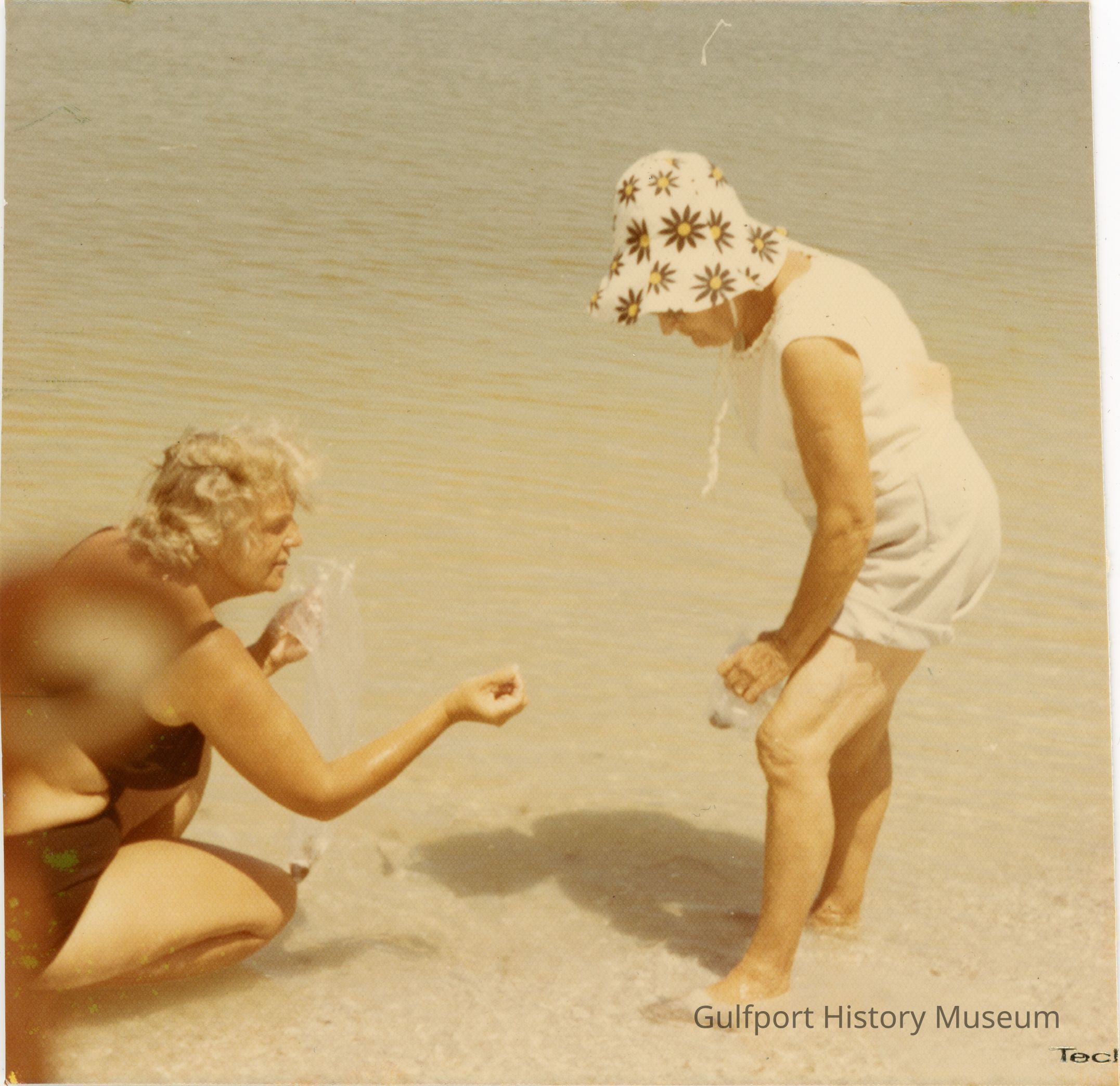 A color photograph of two women wading ankle deep in the water looking for shells on Gulfport Beach. The woman in the black swimsuit is showing something to the woman in a white swimsuit and flower bucket hat. Each are carrying clear, plastic bags.