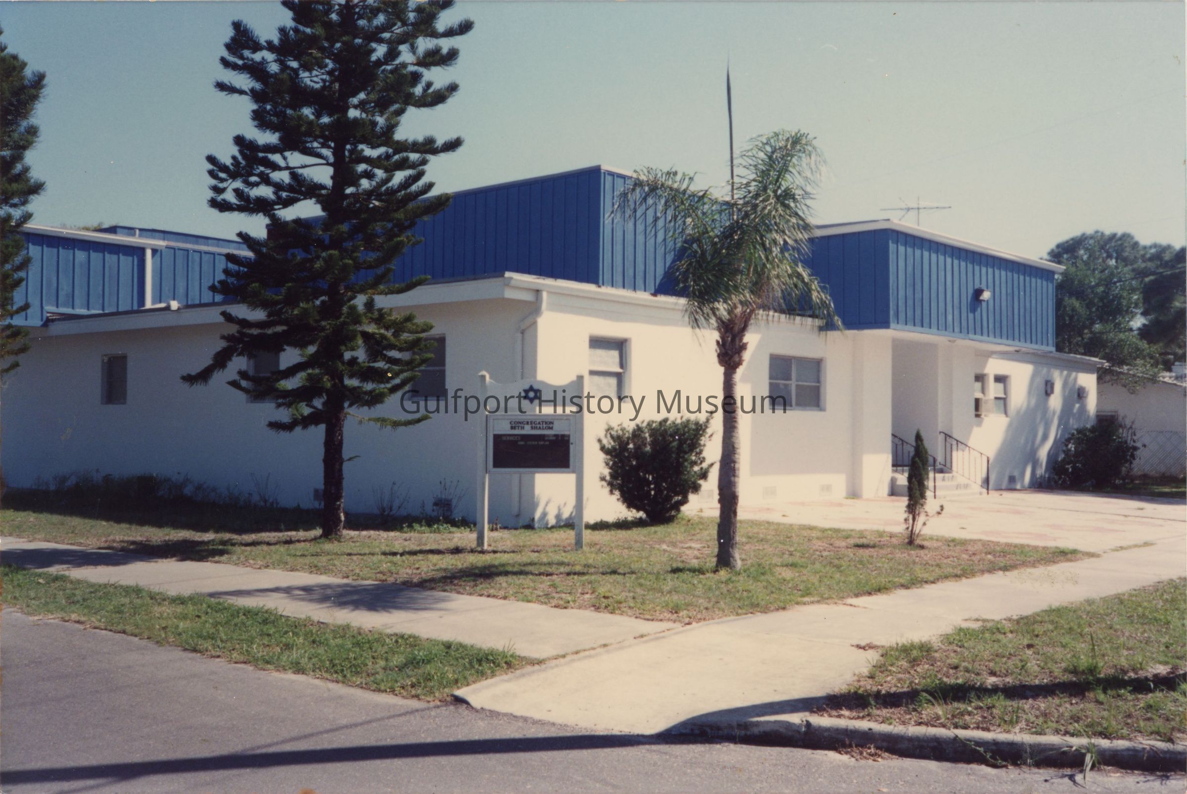 A color photograph of the Congregation Beth Sholom taken from the corner of Tangerine Ave S and 54th St S across from Tomlinson Park. The building is white with a blue roof. There is a sign with a Star of David facing the road which reads "CONGREGATION BETH SHALOM" and has service hours.