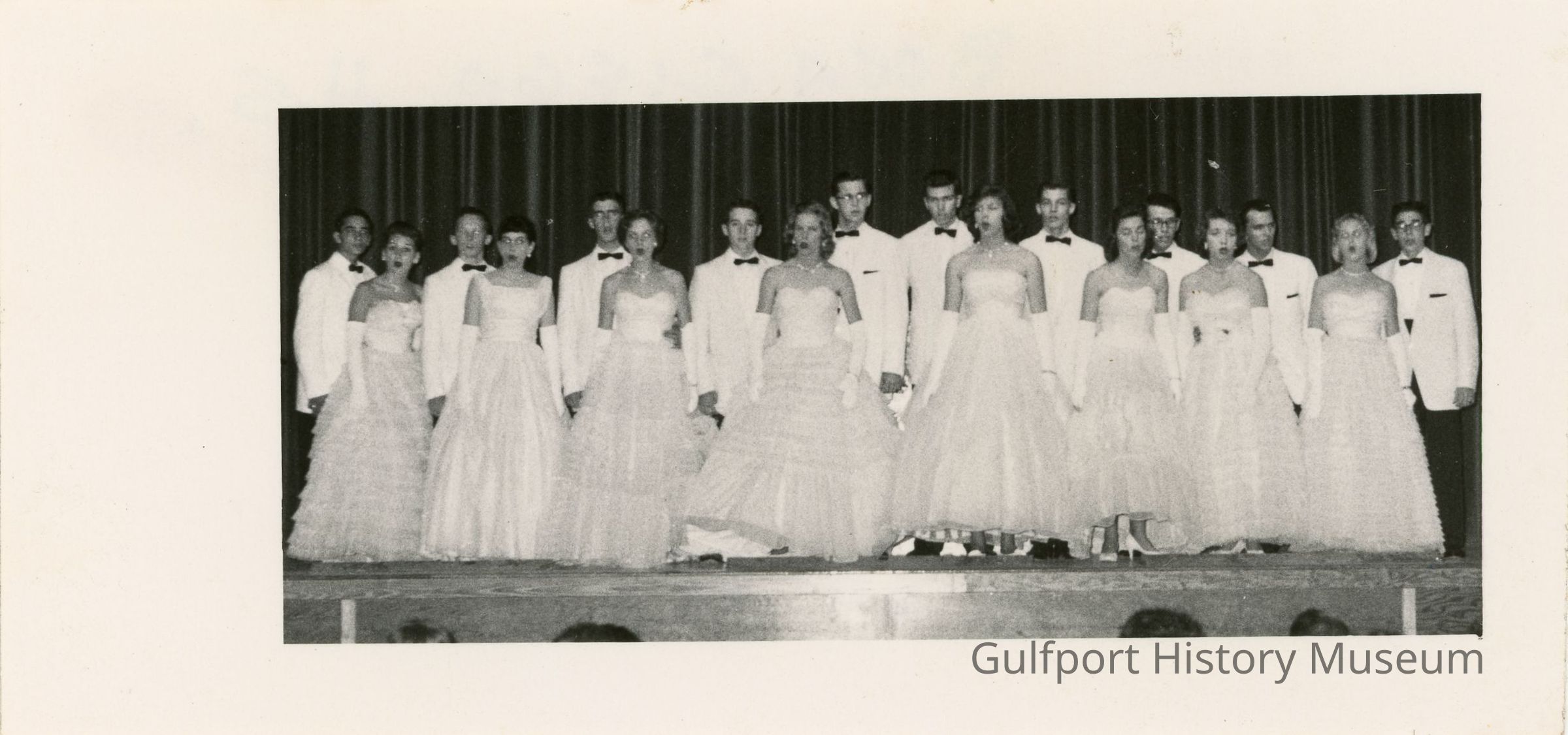 A black and white photograph of a chorus performing onstage.Photograph Details