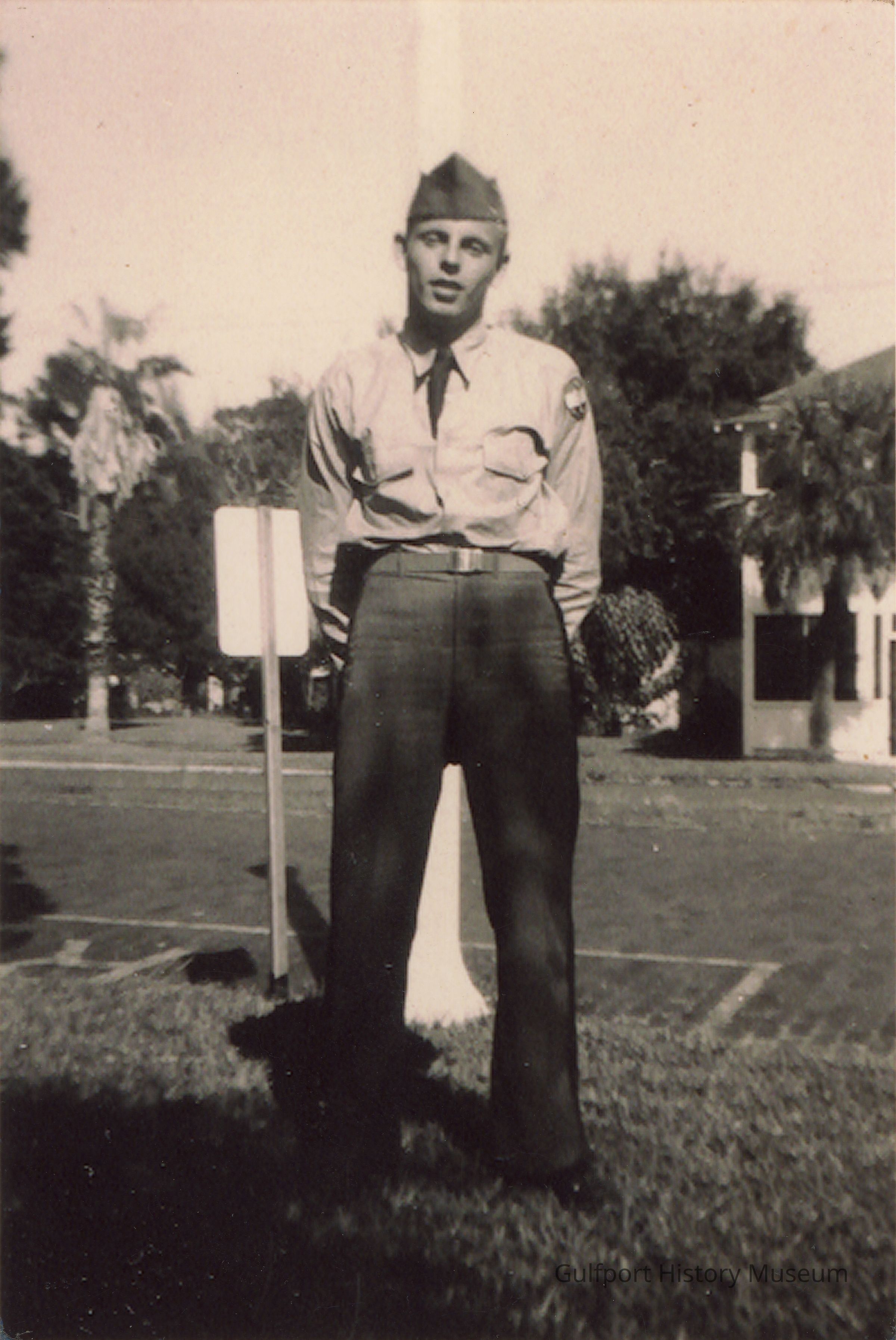 A black and white photographic print of David Swick in army attire. He is standing outside of the Cedars of Lebanon Hospital.