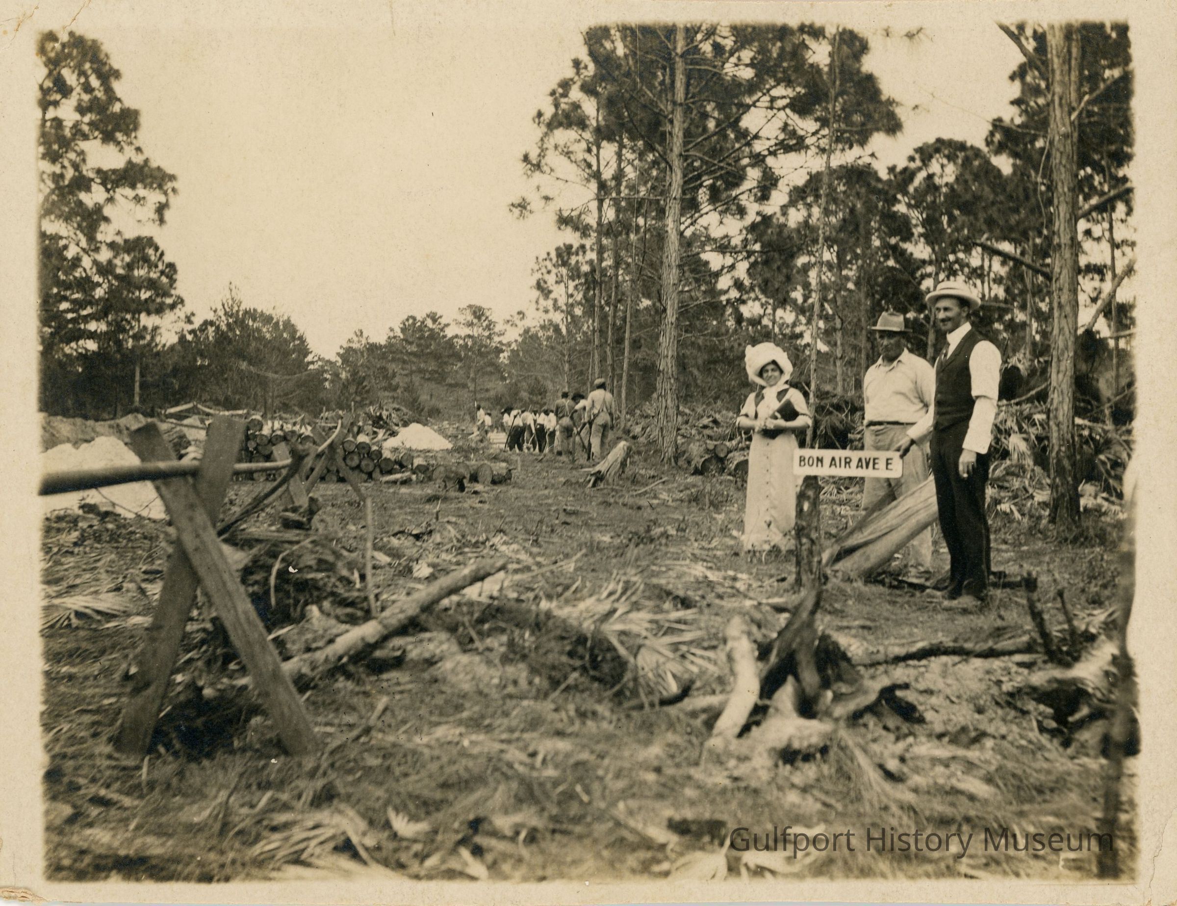 A black and white photograph of Davis Blvd (now Beach Blvd) while it was being cleared of trees. Two men and a woman standing in the foreground by a sign which reads, "BON AIR AVE E." A group of men can be seen working in the background amongst piles of logs and debris.