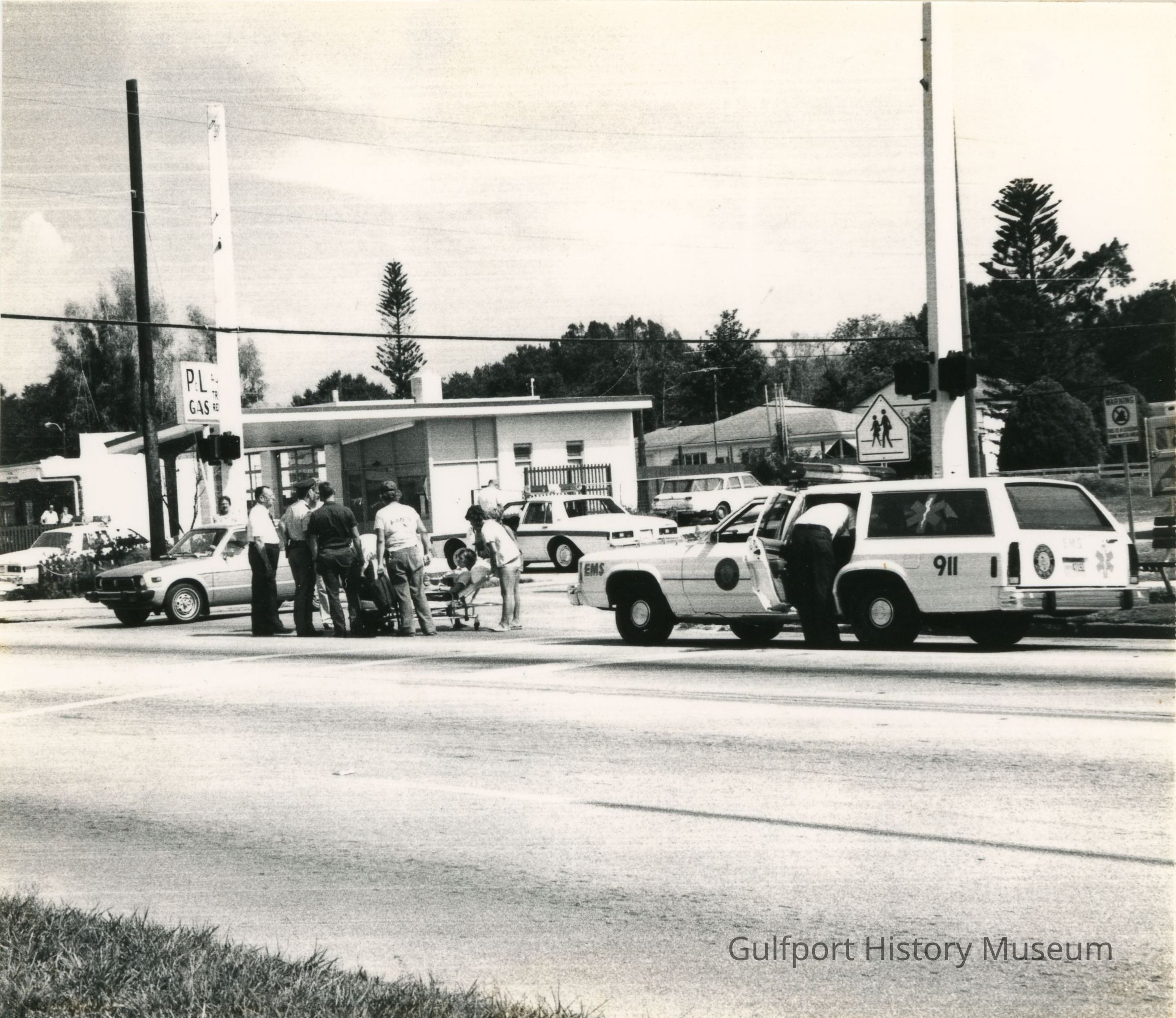 A black and white photograph of [an accident] at [Gulfport Blvd and 52nd St S].