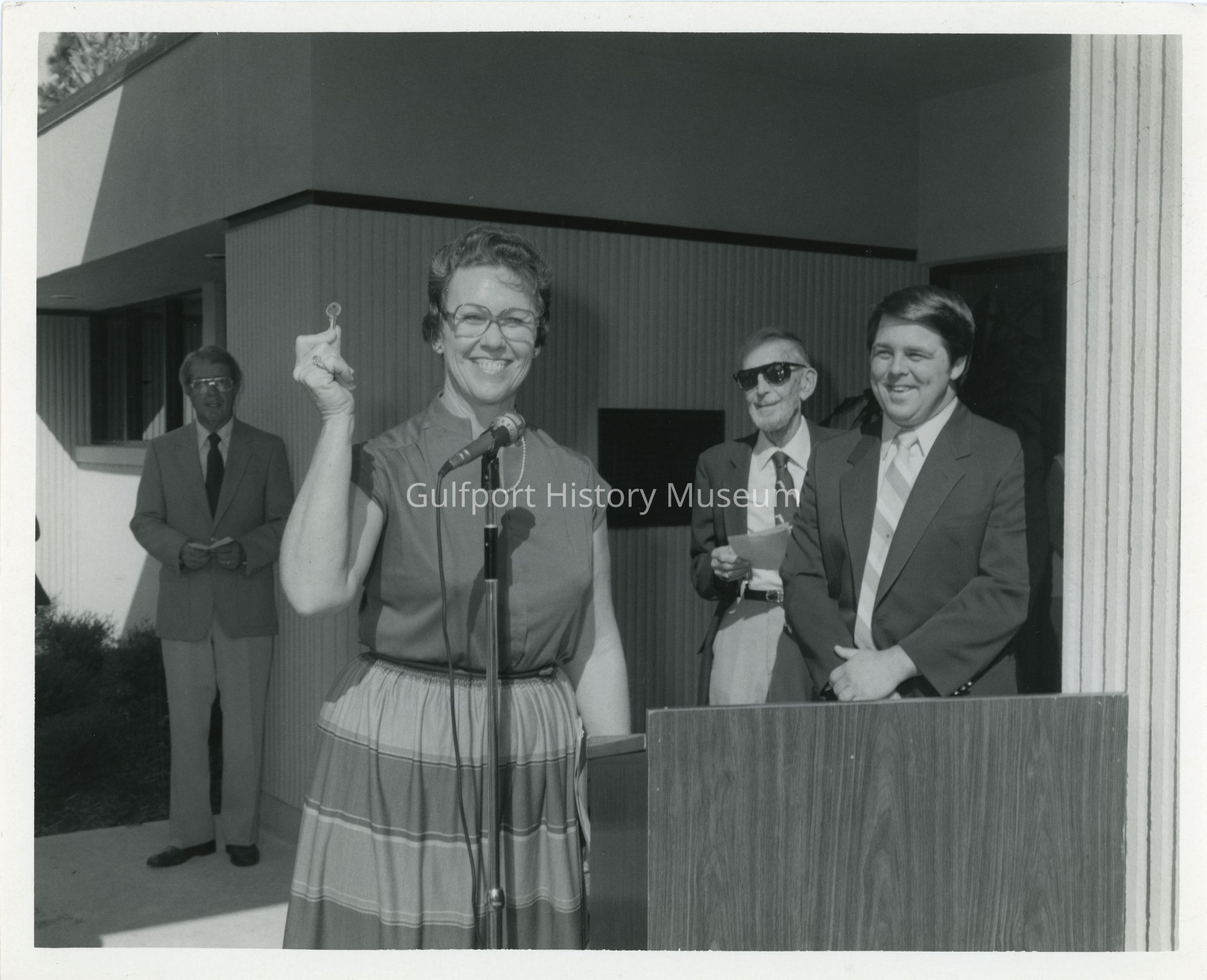 A black and white photograph of the dedication ceremony of the Gulfport Senior Center on October 11, 1983. Yvonne Johnson is holding a small key and stands at a microphone next to a wooden podium. Three men in suits stand behind her.