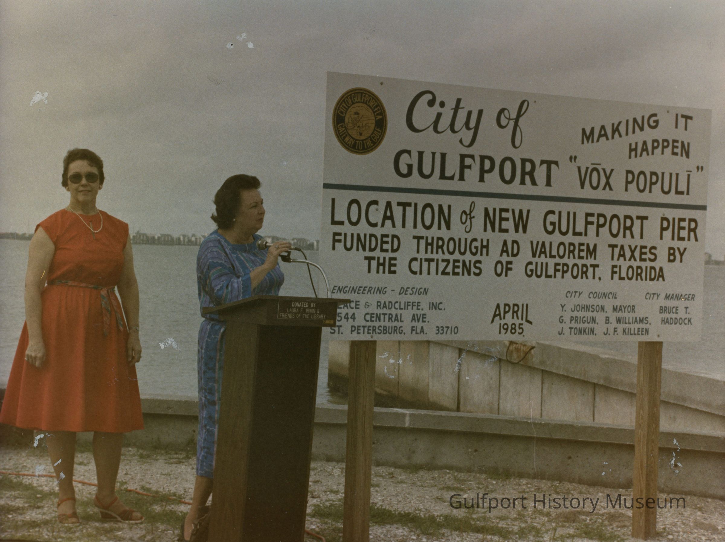 A color photograph of two women standing in front of a sign reading "City of GULFPORT MAKING IT HAPPEN "VŌX POPULĪ" | LOCATION of NEW GULFPORT PIER FUNDED THROUGH AD VALOREM TAXES BY THE CITIZENS OF GULFPORT, FLORIDA | ENGINEERING - DESIGN [?]ACE & RADCLIFFE, INC. [?]544 CENTRAL AVE. ST. PETERSBURG, FLA. 33710 | APRIL 1985 | CITY COUNCIL Y. JOHNSON, MAYOR G. PRIGUN, B. WILLIAMS, J. TONKIN, J.F. KILLEEN CITY MANAGER BRUCE T. HADDOCK." One woman in blue is speaking into microphone on a podium. The podium has a plaque that reads: "DONATED BY LAURA F. IRWIN & FRIENDS OF THE LIBRARY." Mayor Yvonne Johnson stands behind her in a red dress and looks at the camera.Photograph Details
