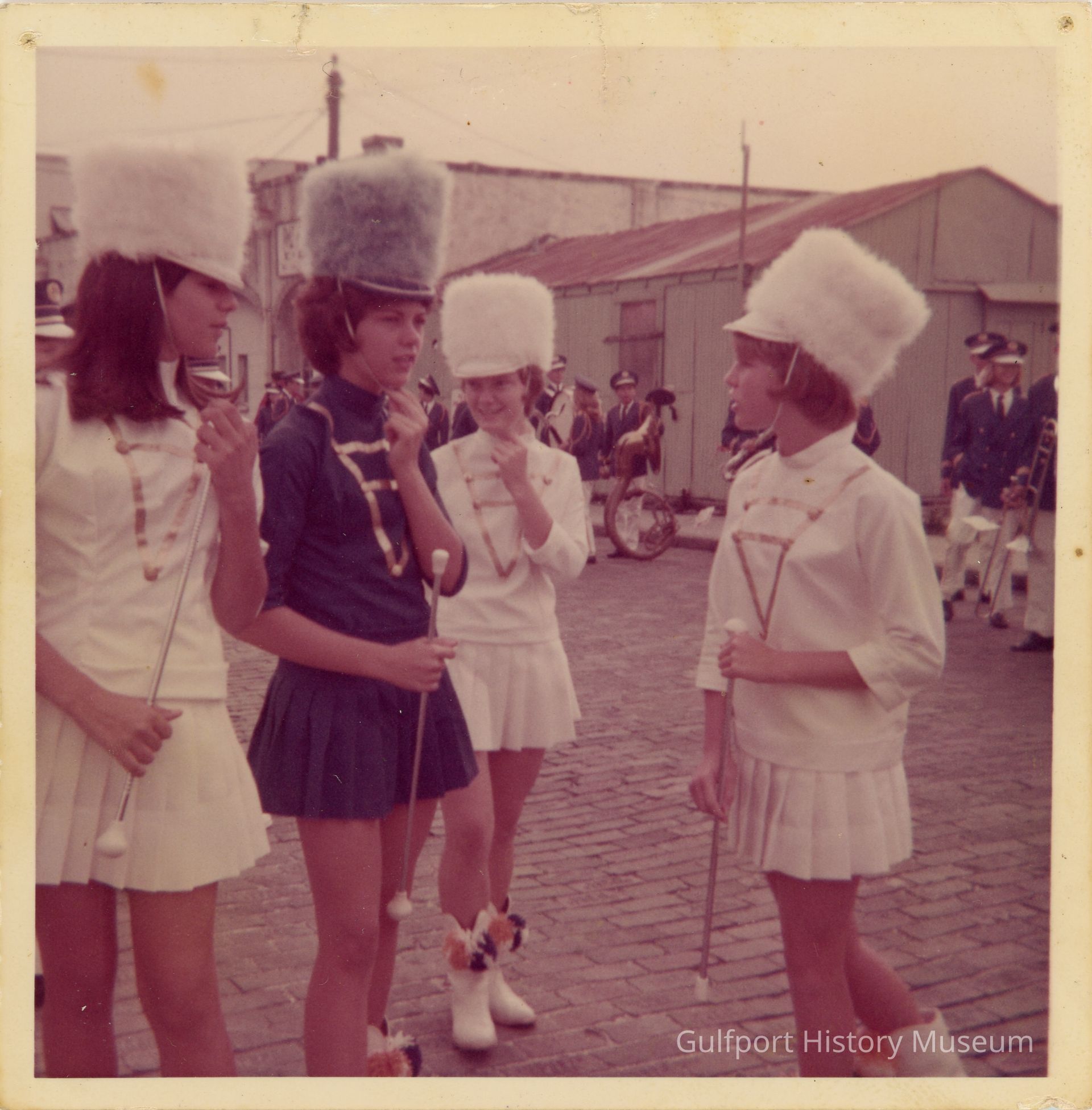 A color photograph of the baton twirlers from the Disston Junior High Band. Three of the girls are wearing white uniforms with a golden downward facing triangle pattern on their shirts, while one wears the same uniform in dark blue and gray.