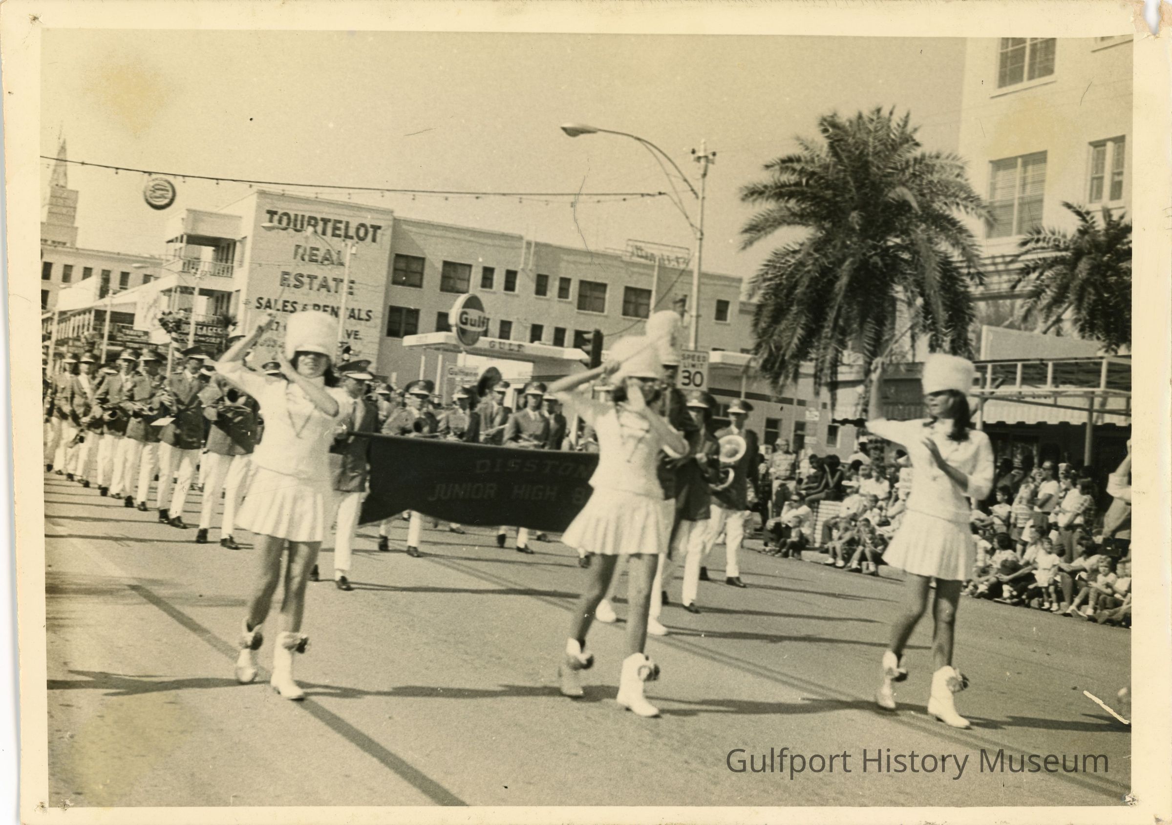A black and white photograph of the Disston Junior High Band during a parade in downtown St. Petersburg. Baton twirlers in white uniforms stand in a row before the band. Two members of the band are holding a sign which reads "DISSTON JUNIOR HIGH BAND," with the band following behind them. Onlookers are watching from the side of the street. A building in the background reads, "TOURTELOT REAL ESTATE."
