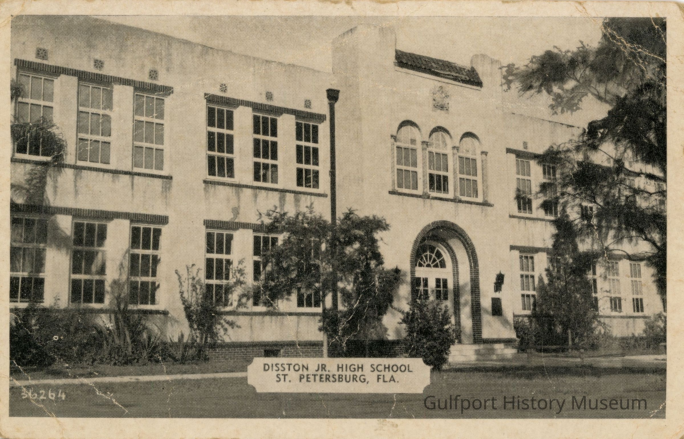A black and white [photochrome] postcard showing Disston Junior High School. "DISSTON JR. HIGH SCHOOL ST. PETERSBURG, FLA."