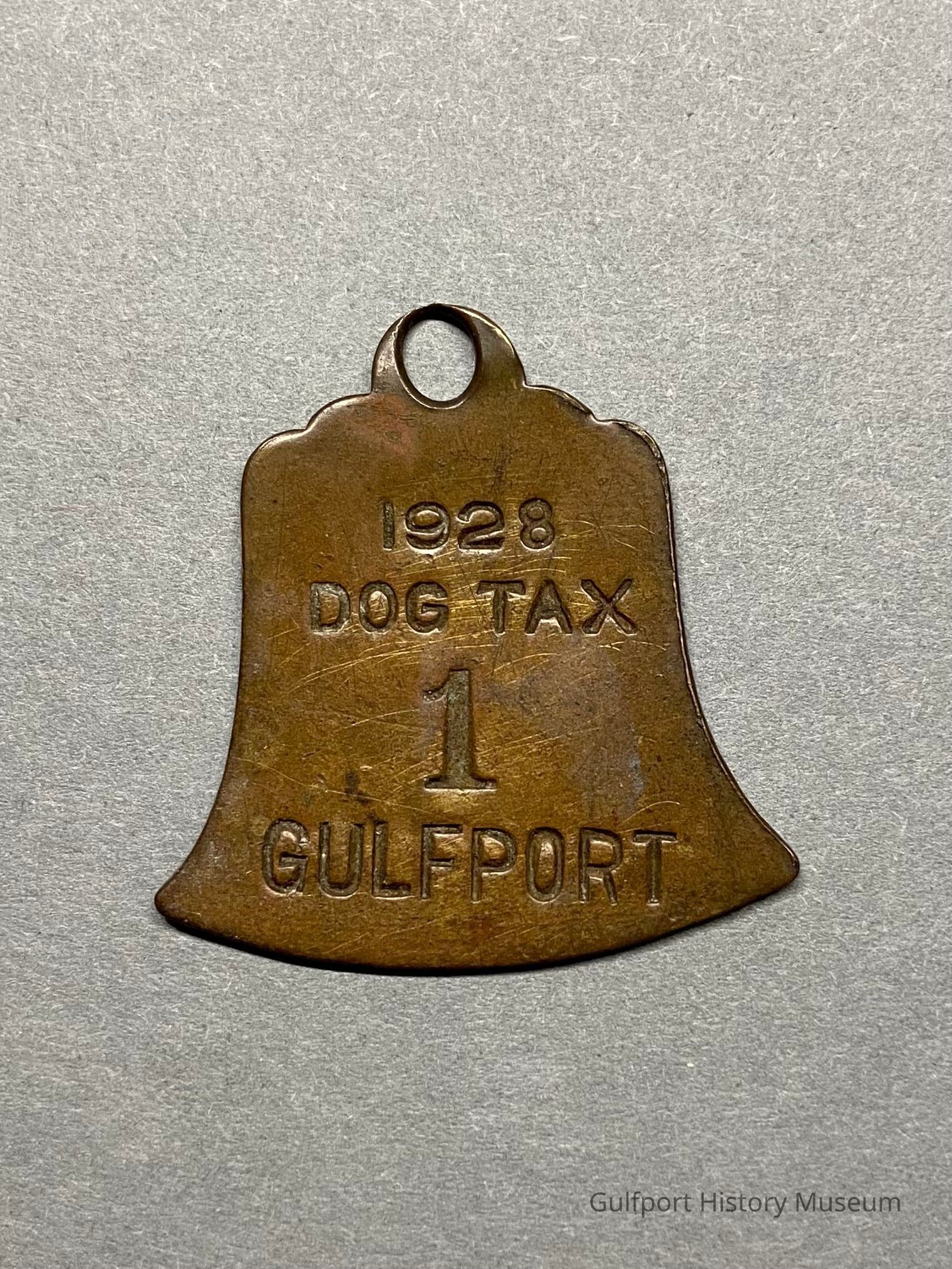 A brass, bell-shaped dog tax license tag, dated 1928.