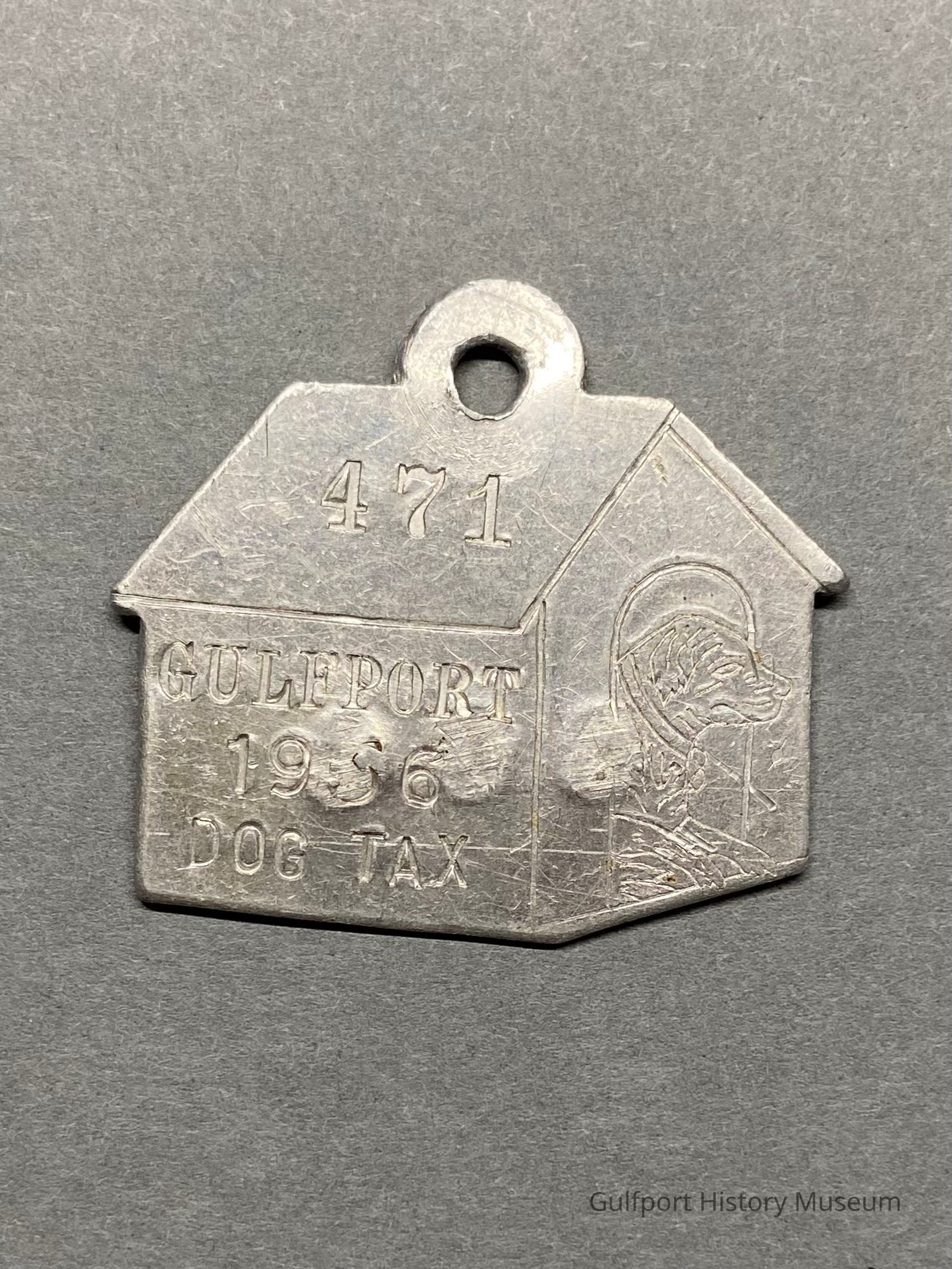 A silver, dog house-shaped dog tax license tag, dated 1966.