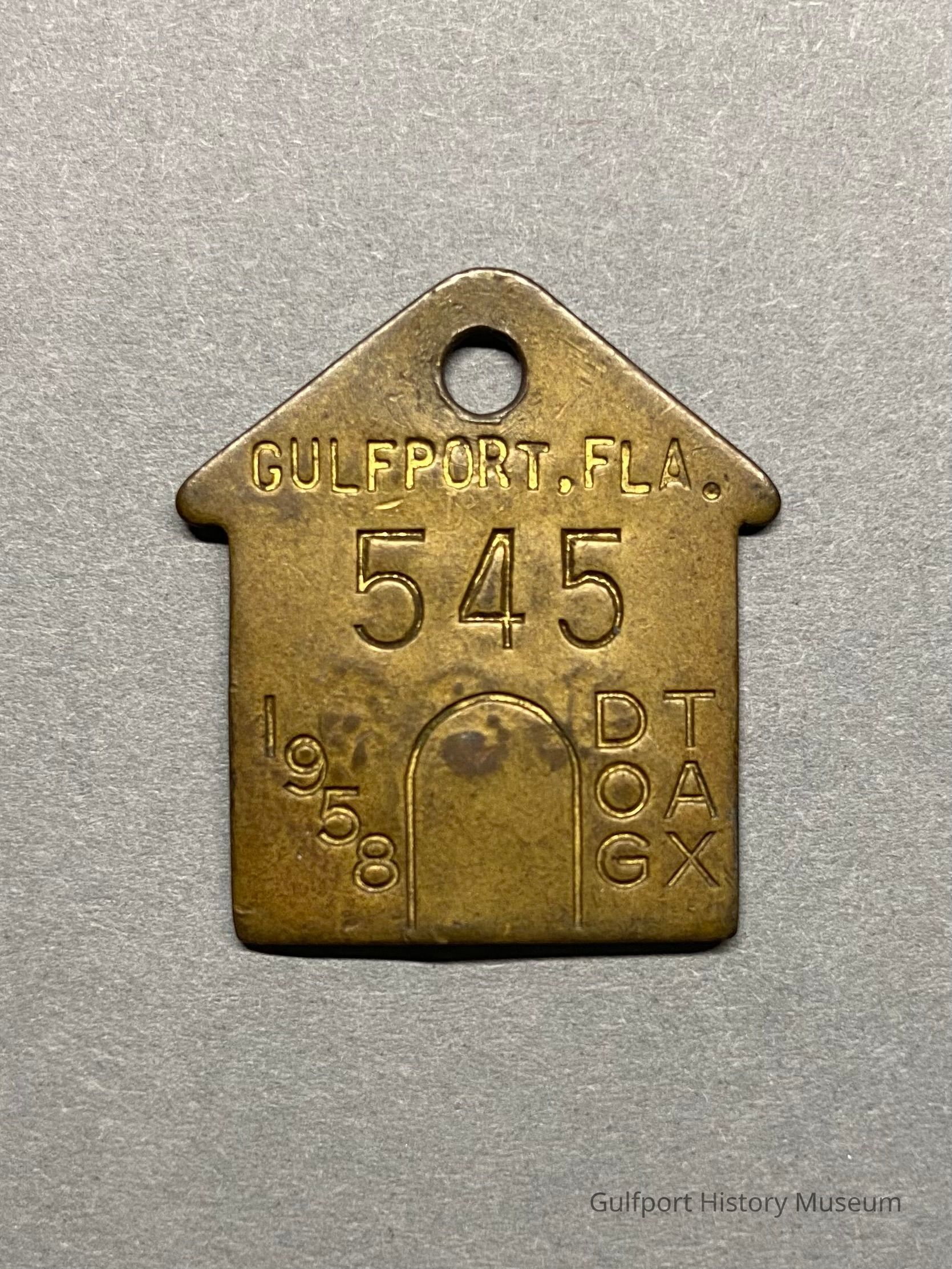 A brass, house-shaped dog tax license tag, dated 1958.
