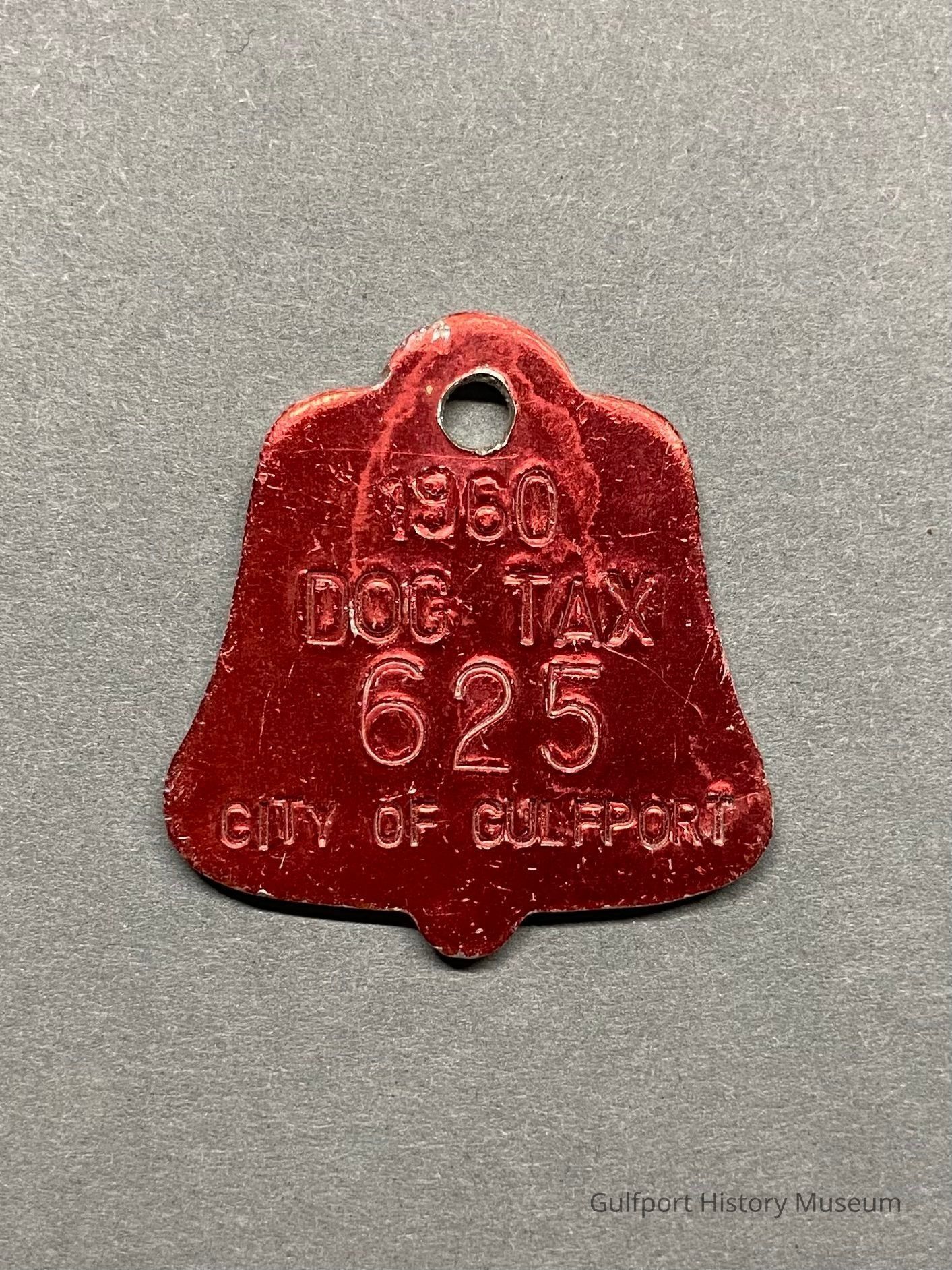 A red, bell-shaped dog tax license tag, dated 1960.