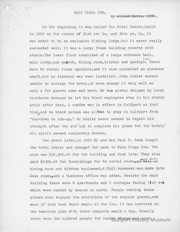 Two [drafts] of a brief history of the Boca Ciega Inn by Allean Davis, included as chapter 17 in Our Story of Gulfport, Florida. Also includes information about the Hotel Dobler and racial segregation/sundown curfews.