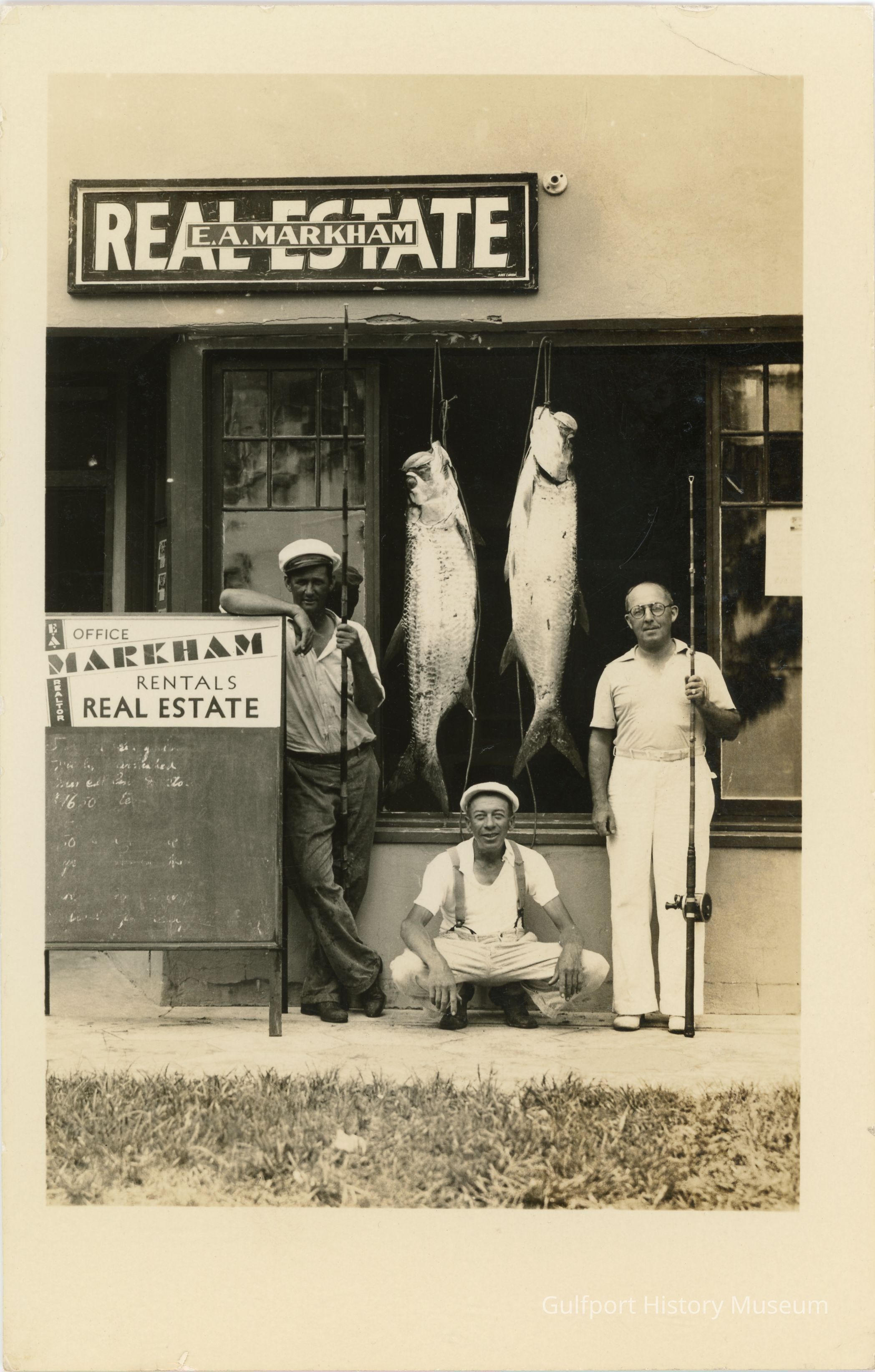 A black and white photograph postcard showing Jack Fuller, Jay Auble, and Edwin Asa Markham displaying their catch, two large tarpon, in the window of the E.A. Markham Real Estate office. The man on the left is leaning on a sign that reads "E.A. MARKHAM REALTOR OFFICE RENTALS REAL ESTATE." The man on the left is wearing a captain's hat and holding a fishing rod, the man in the middle is squatting, and the man on the right is also holding a fishing rod.