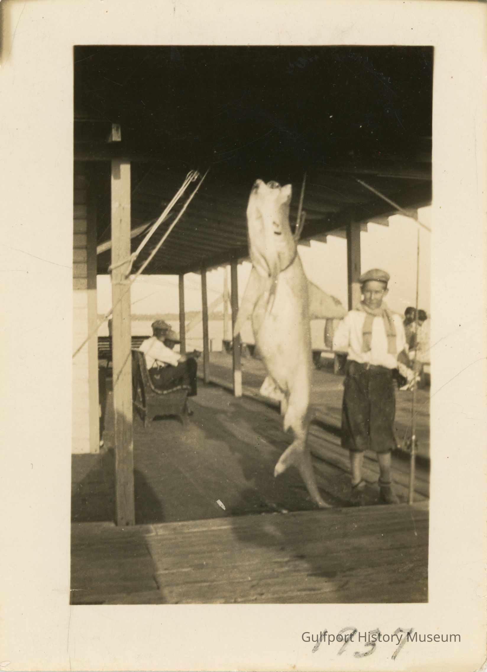 A black and white photograph of a boy, Eddie Markham, standing next to a caught shark at the end of the wooden Gulfport Pier. He holds a fishing pole. Other people can be seen sitting on benches in the background.