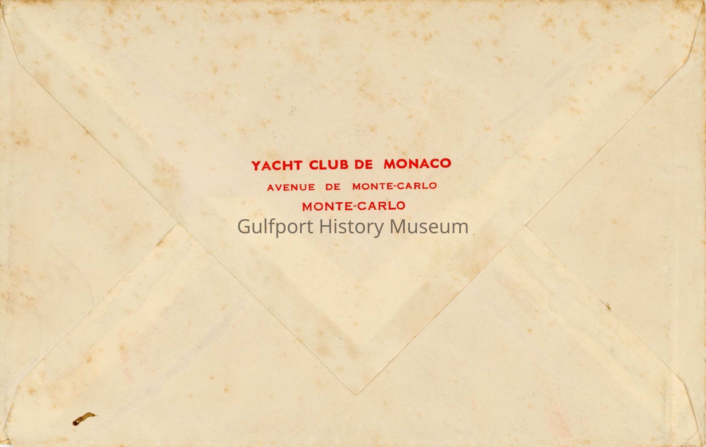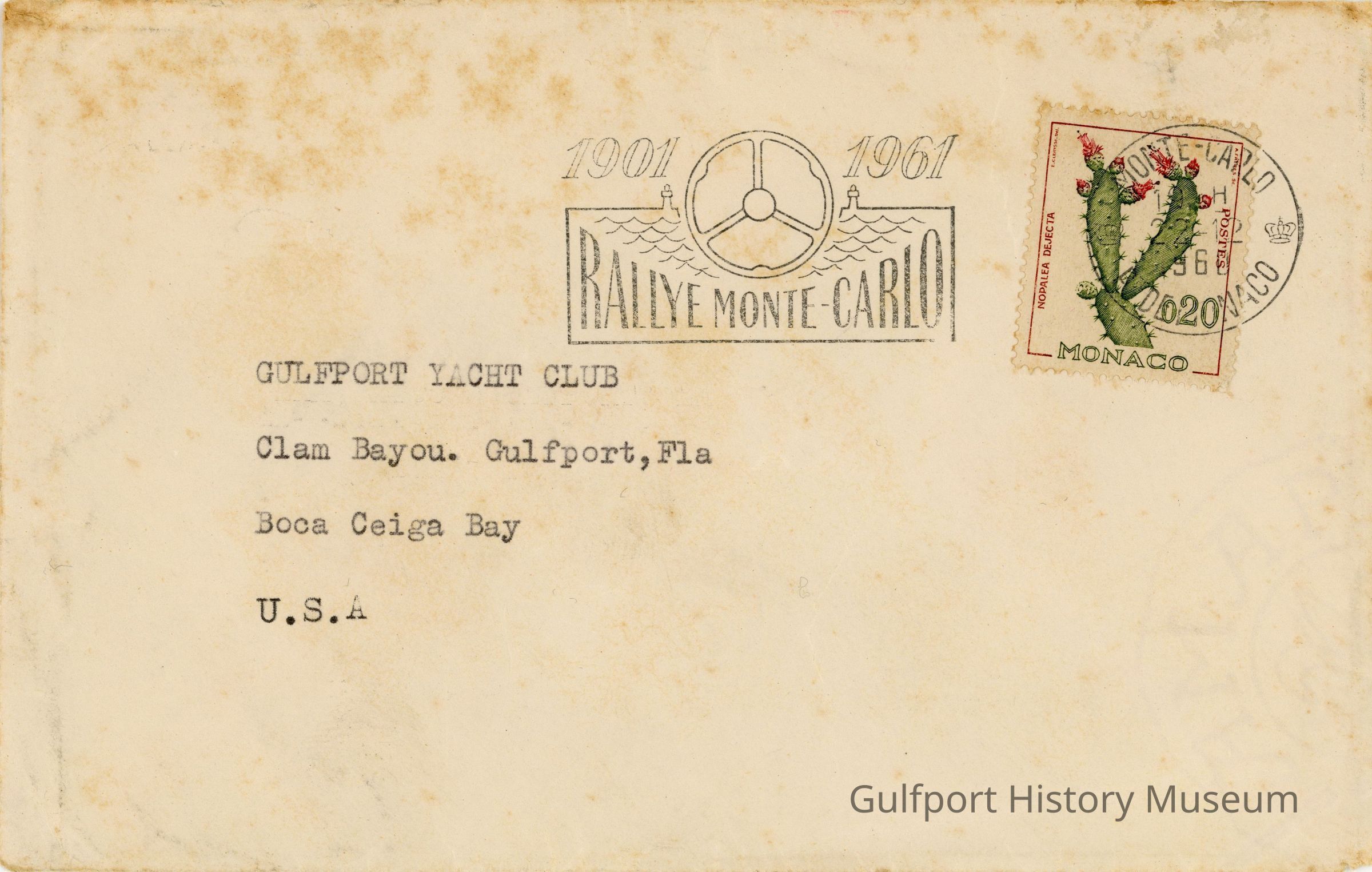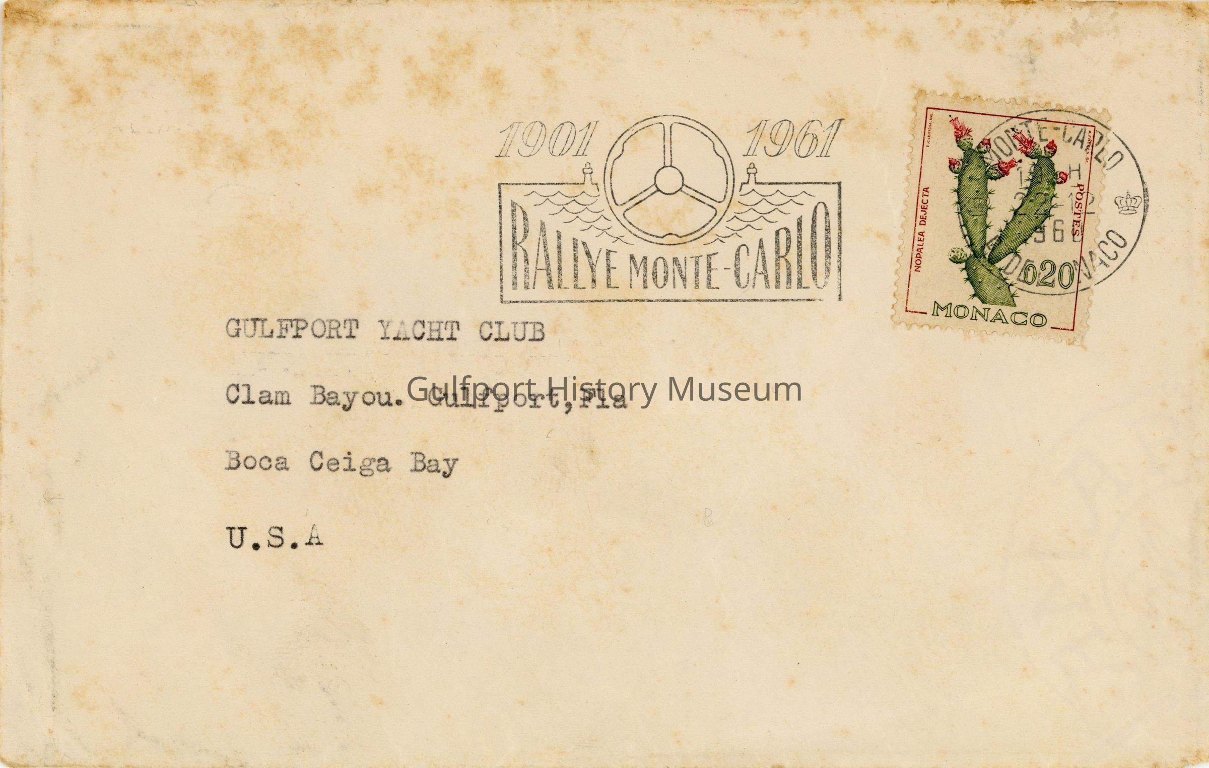A Yacht Club de Monaco branded envelope addressed to the Gulfport Yacht Club. A stamp on the front features a marina and wheel and reads "1901 - 1961 RALLYE MONTE-CARLO."