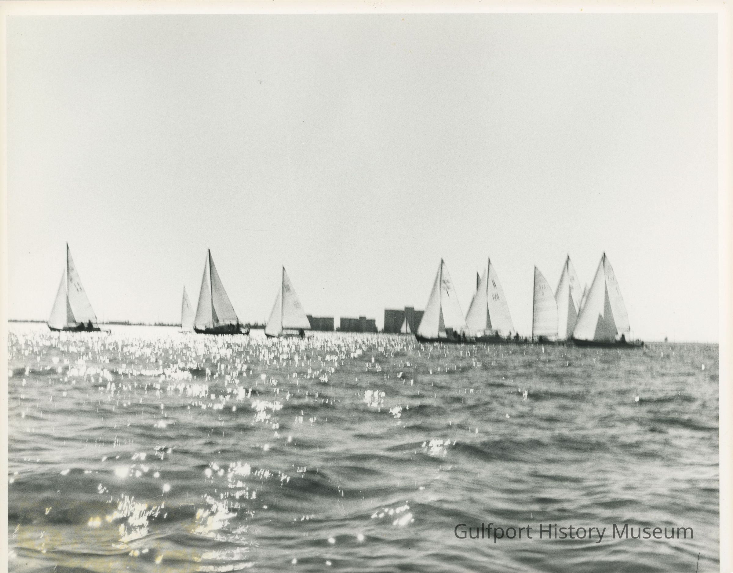 A black and white photograph of several sailboats in Boca Ciega Bay in a regatta organized by the Boca Ciega Yacht Club.