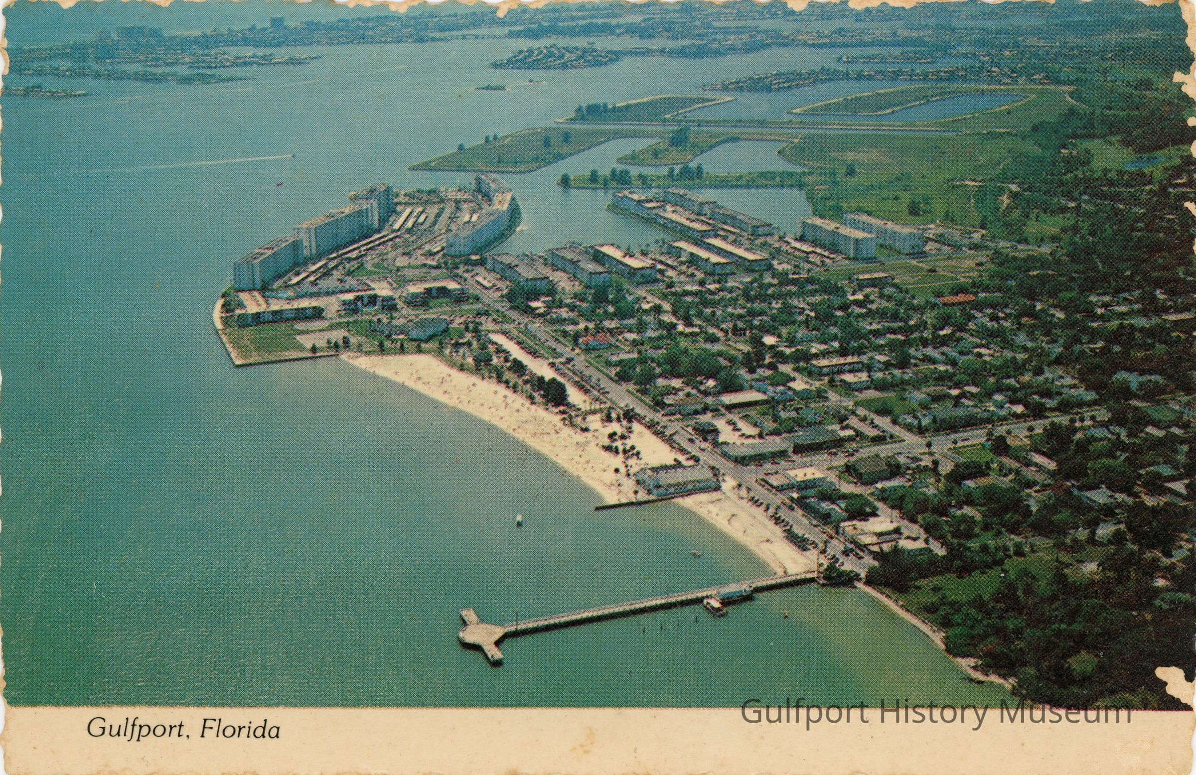 A scan of a color photochrome postcard showing an aerial view of Gulfport's shore, prominently featuring the pier on Boca Ciega Bay, Gulfport Casino, Gulfport Beach, and Town Shores.Subject
