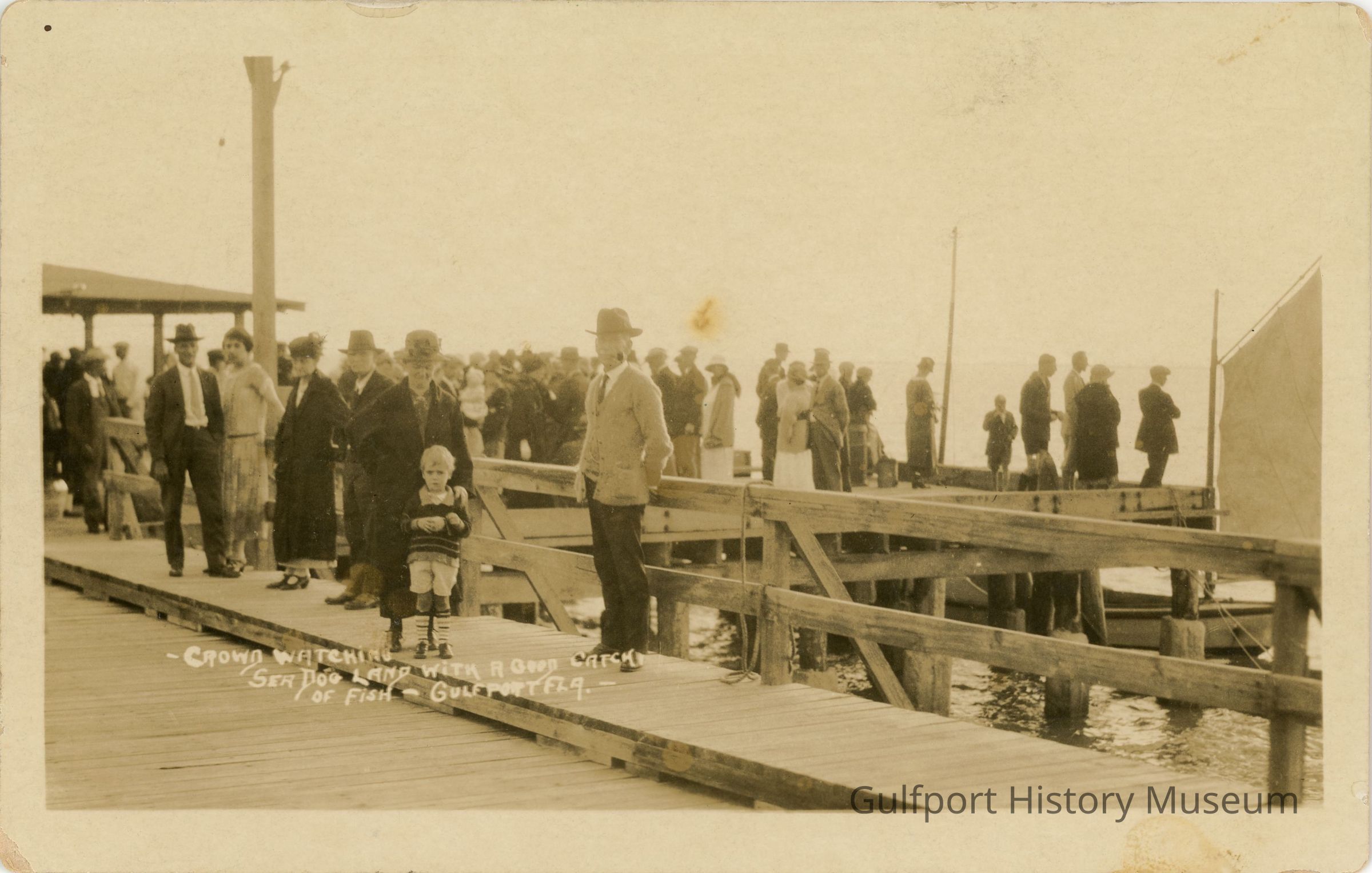" - CROWD WATCHING SEA DOG LAND WITH A GOOD CATCH OF FISH - GULFPORT FLA. -"Subject