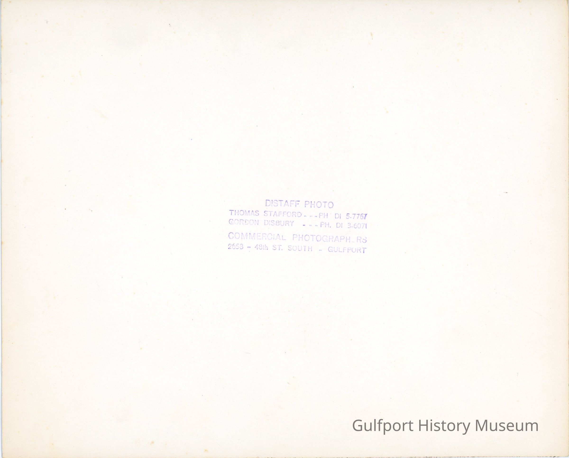 A black and white photograph of the Gulfport Lions Club Auxiliary seated at three tables all in semi-formal attire. The interior is decorated with streamers, and each table is lined with a white tablecloth and decorative candles. There is a Lions Club centerpiece at the center of the head table.Photograph Details