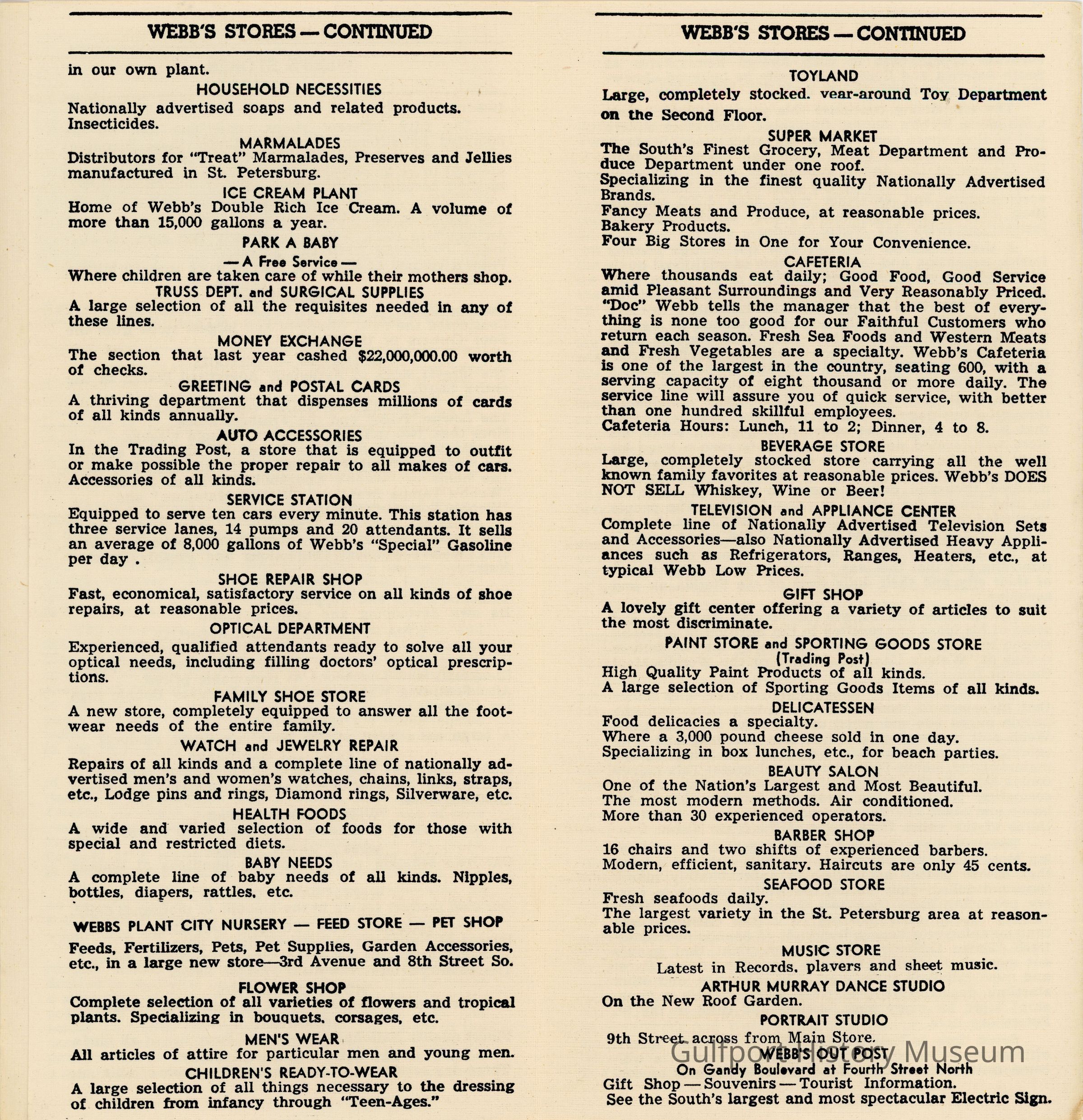 Where thousands eat daily; Good Food, Good Service amid Pleasant Surroundings and Very Reasonably Priced. "Doc" Webb tells the manager that the best of everything is none too good for our Faithful Customers who return each season. Fresh Sea Foods and Western Meats and Fresh Vegetables are a specialty. Webb's Cafeteria is one of the largest in the country, seating 600, with a serving capacity of eight thousands or more daily. The service line will assure you of quick service, with better than one hundred skillful employees.