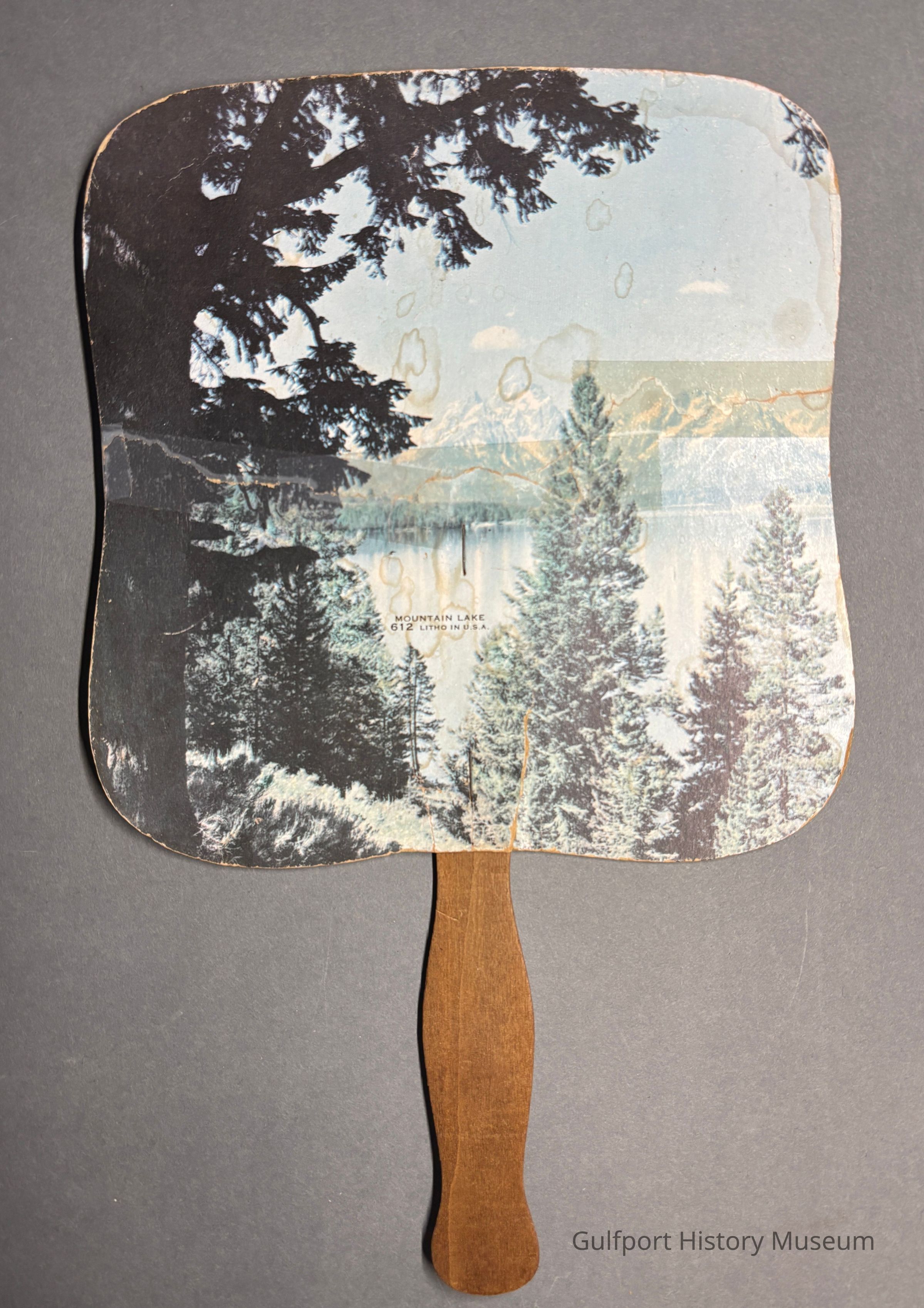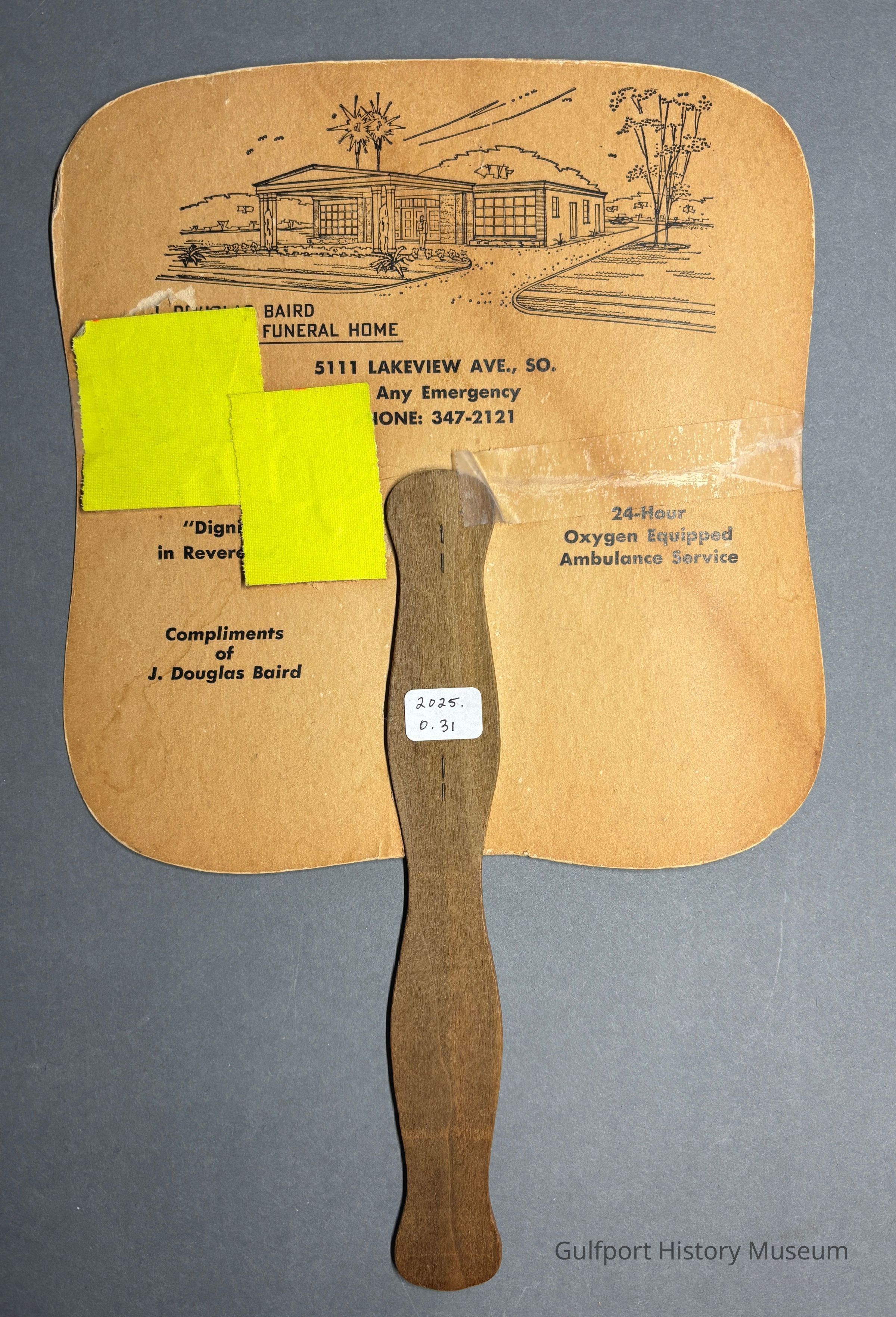 A J. Douglas Baird promotional paper hand fan with a flat wooden handle. The front features a color scenic image with trees, lake, and mountains. The reverse features an illustration of the J. Douglas Baird Funeral Home with business information.